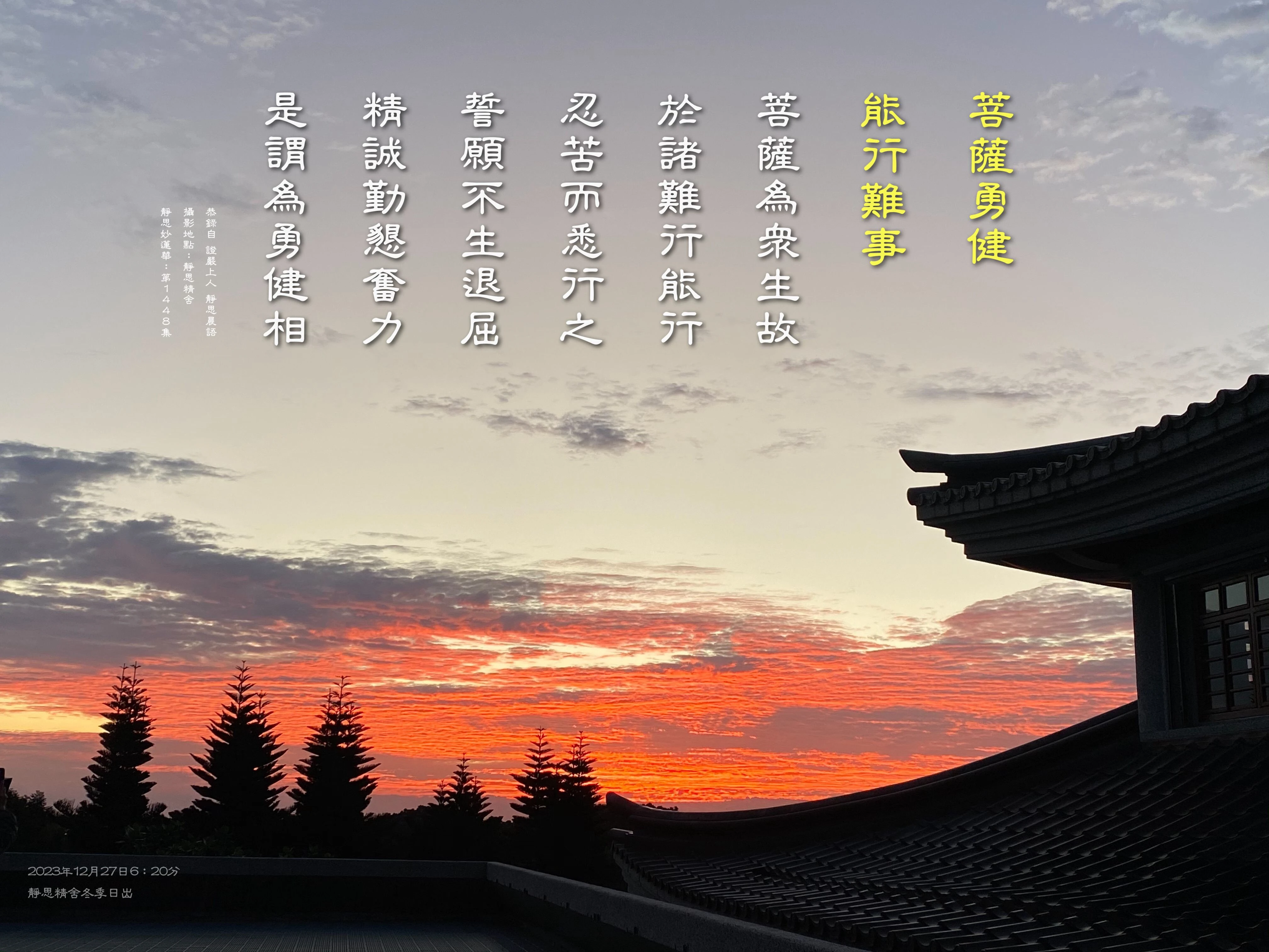 今天一早上人說:我們很甘願、歡喜,為了覺悟的道路,我們甘願走。走往哪裡去呢?就是為苦難眾生願意去付出。還有「搶晴天,戰雨天」天煎地逼、煮日煎沙,菩薩要發心入人間,才有辦法真正「能為難事」。