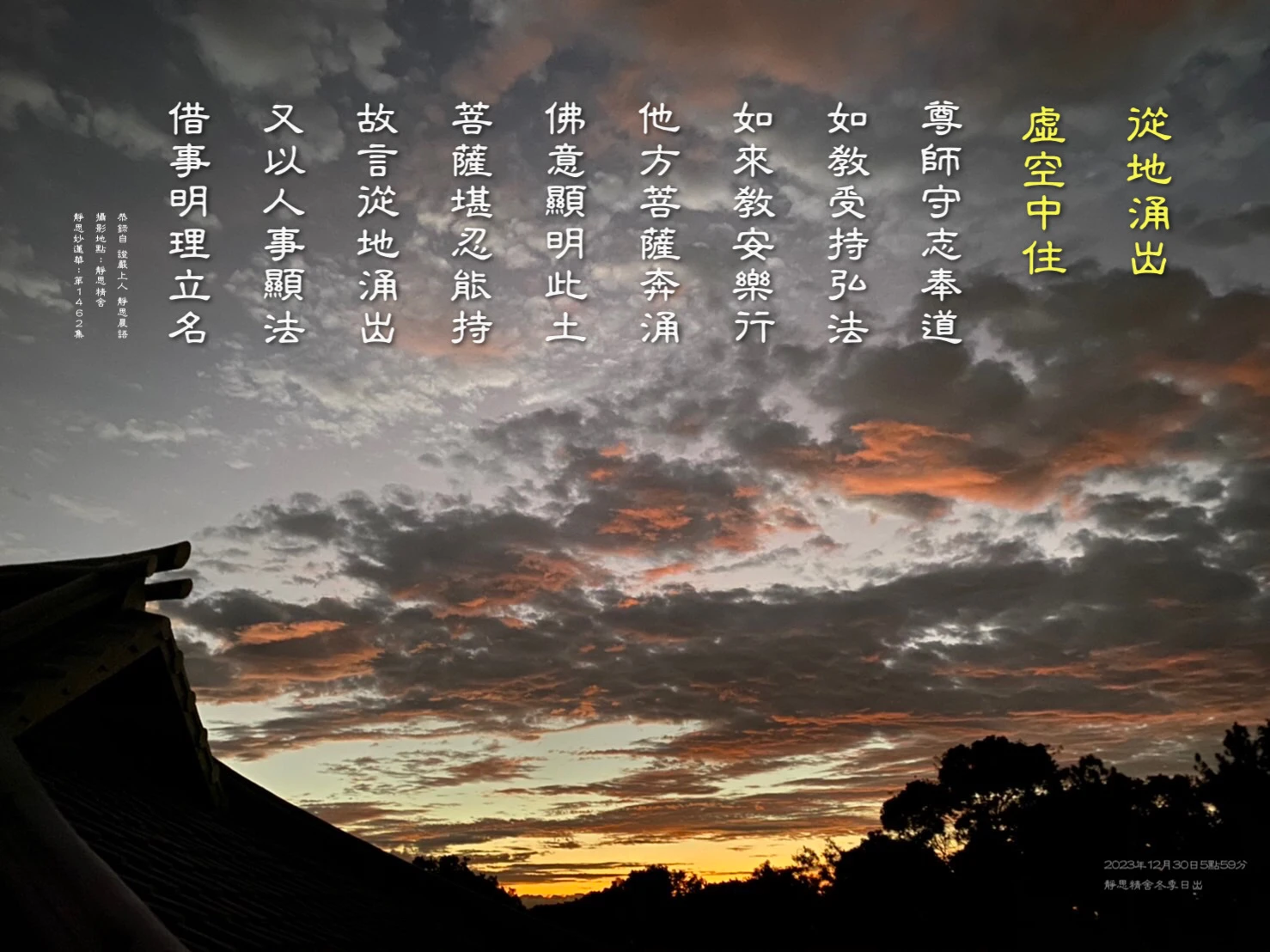 關於「從地涌出 虛空中住」,上人表示,「從地涌出」即代表我們的真如本性,已突破煩惱的殼;有如無明的地殼將種子埋覆著,待因緣成熟,種子便會突破。而「從地涌出」的意涵,讓人想到一切自有因緣,因此布善種子非常重要。在接引會眾時,不放棄任何機會,自身也要把握因緣。