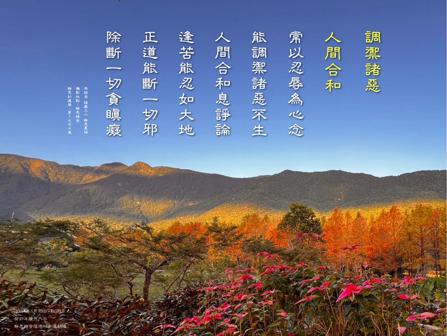 上人手札:「常以忍辱為心念,能調禦諸惡不生,人間合和息諍論。逢苦能忍如大地,正道能斷一切邪,除斷一切貪瞋癡。」