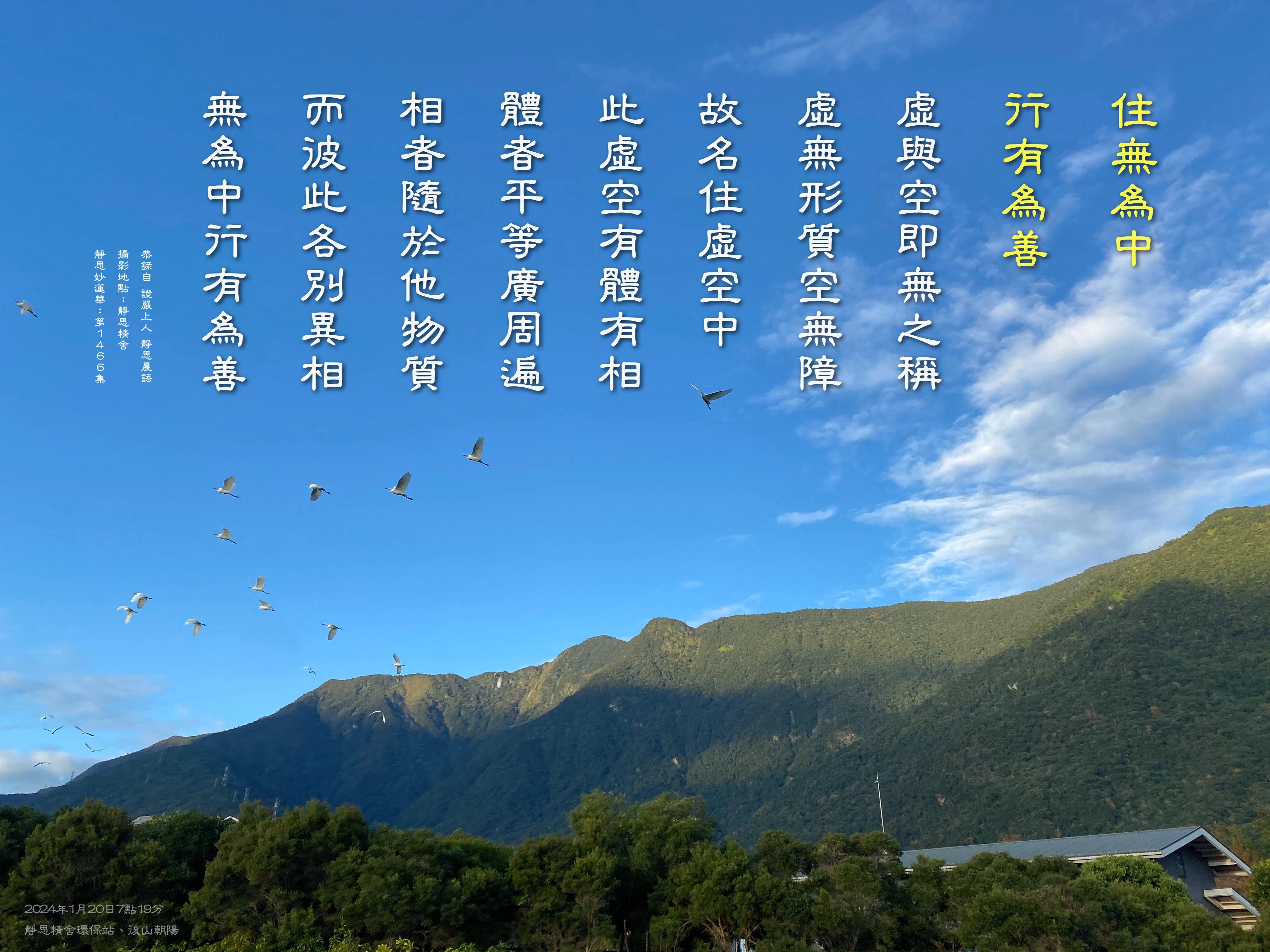 上人開示:空就是無煩惱了,就像虛,無體性,也沒有質的限量著,所以也空掉了,就無障礙。我們在行有為善中,更要體會無為法。不執念,能善解,調整好人我之間的相處界限;不受傷害,當然更不能有損他人,這才是真正做到利人利己。