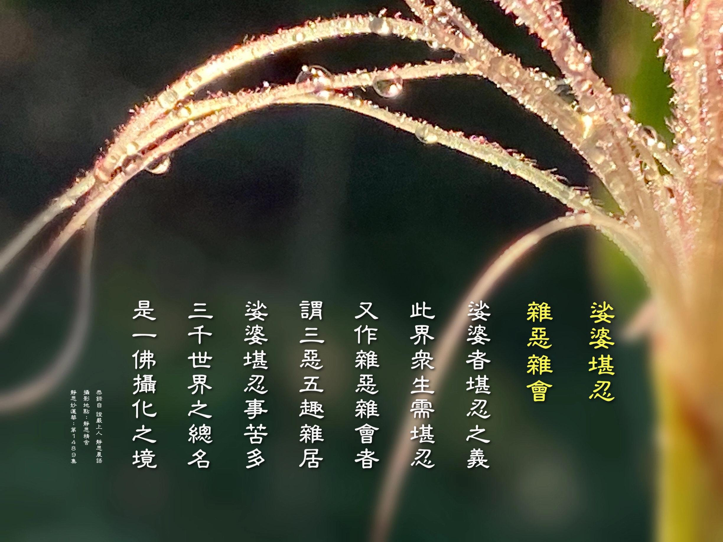 「娑婆」的意思是堪忍,譯作堪忍世界。名稱叫做「堪忍」,顧名思義我們就能夠知道要堪得忍耐。這種的堪得忍耐,眾生是由不得自己,造業來人間,就是依報、正報,糊里糊塗來到人間。
