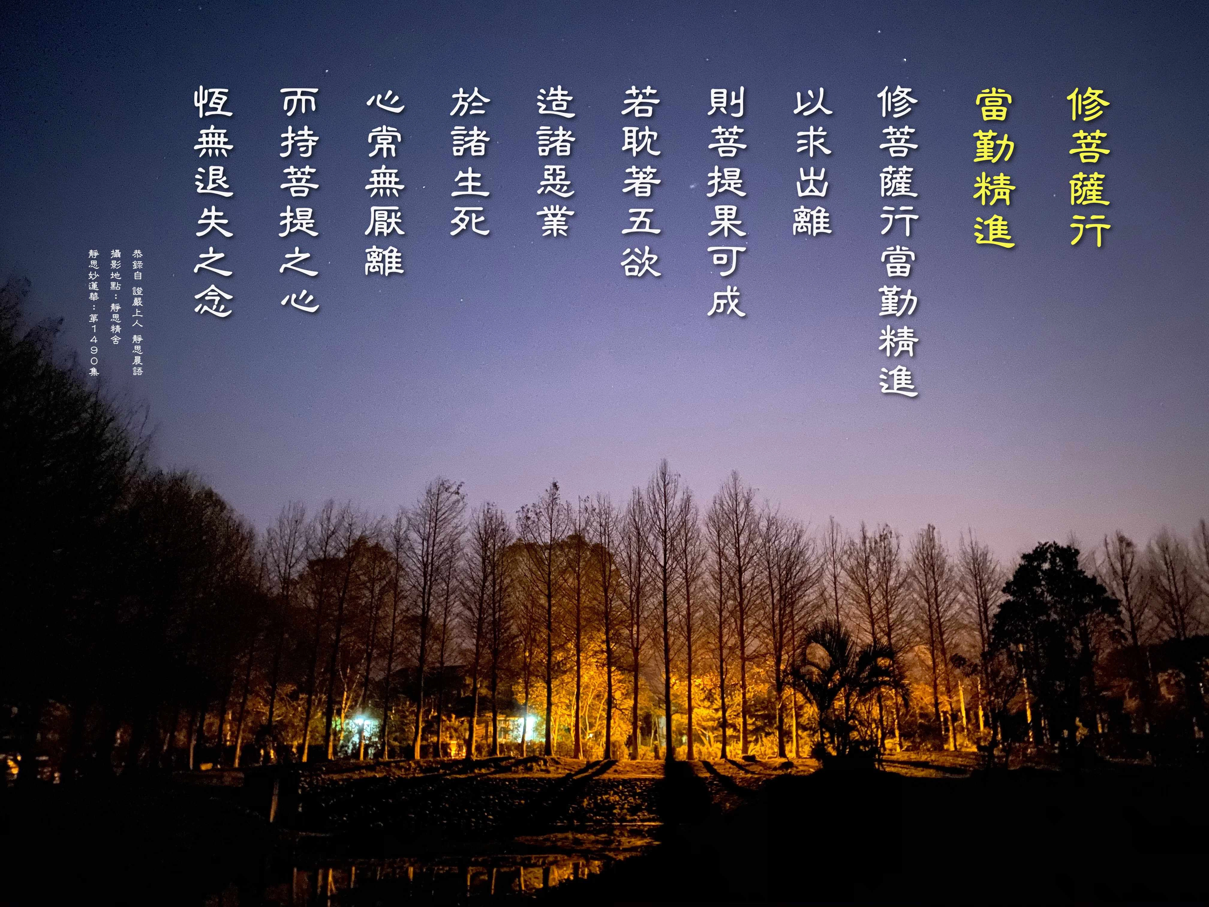上人開示:常常聽到「人多,很複雜,我要避開了」,這就不對。不離眾生、安住眾生,如何避開這個是非,不是避開人群,是避開是非。這種懂得帶人,不厭離、不休息,在人群很複雜的當中,是非中要避開是非,我們要好好堅持我們一心。「一心修持善行」,要做我們該做的事情,向前前進。所以,「常樂靜處」,常常「常樂」、好樂在靜處,帶領人,不喧嘩,就是這樣好好穩定修行。