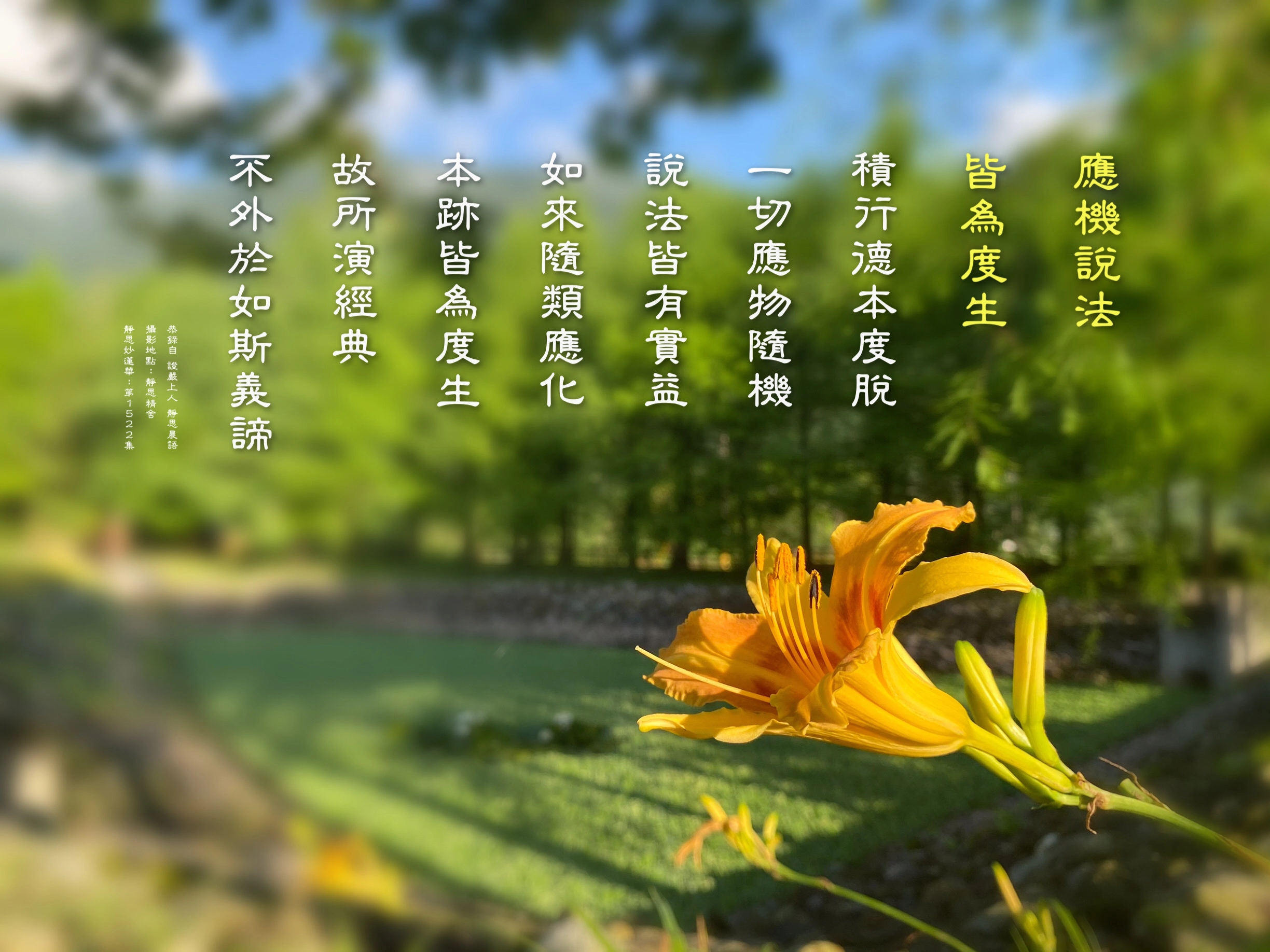 上人說:諸所言說皆實不虛,一一稱實,無有虛妄。凡有言說,皆於眾生實有利益,非是虛語也。好的事情我們一定要相信,好的話我們一定要聽,好的模樣我們一定要學。我們要了解,我們真正要在日常生活中,我們的行為向善,「六度萬行」,不論是做多大的事情,或者是小小微細的付出,無不都是在利益眾生;淺淺的微笑、輕柔的一句話。好好用力,輕柔而有力,我們說的話要讓人聽得進去;要用心、婉轉,讓他能夠接受、了解。法,聽,就是要落實在生活。