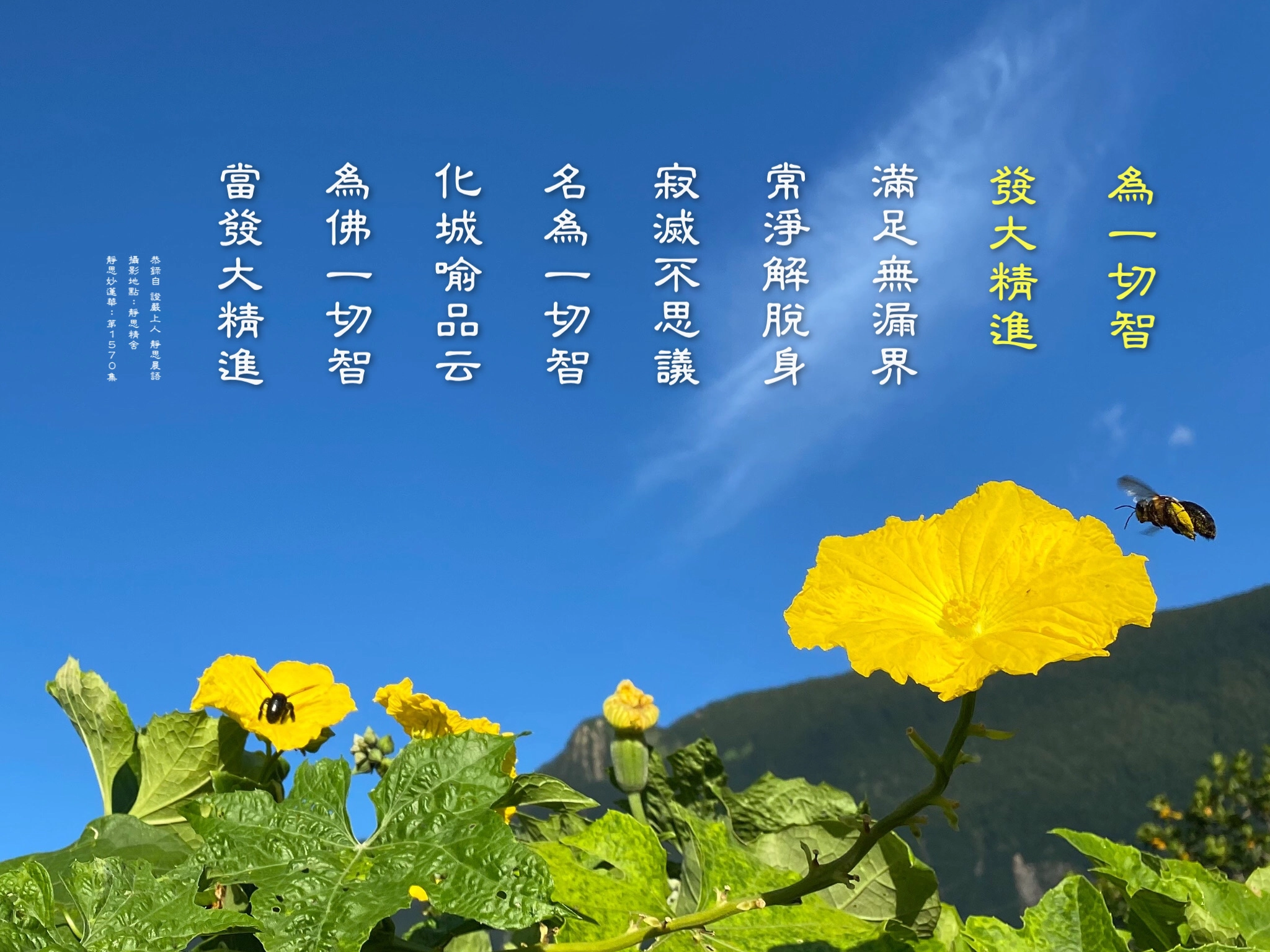 唯有發大精進心,自己身體力行,才有辦法與這個境界會合。要通達世間種種的道理,唯有入人群,了解人群中的煩惱無明,在煩惱群中體會道理,認識了覺道。所以修行非在人群中不可,這就是菩薩的功課,一定要入人群,來成「一切智」,人群中才有辦法看世間普遍的道理,才有辦法去體會這個道理的源頭。