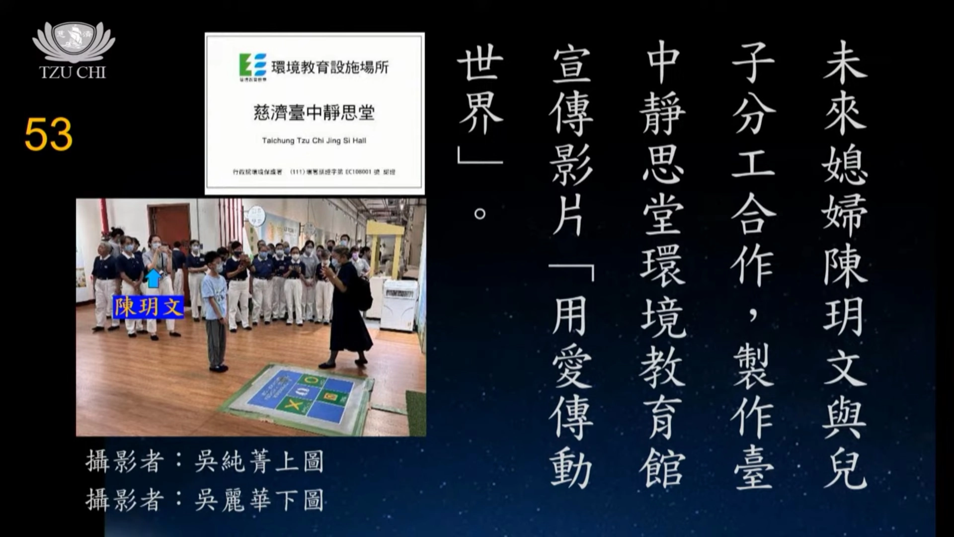 徐銘澤和陳玥文也學以致用,兩人攜手合作,製作了臺中靜思堂環境教育館的宣傳影片《用愛傳動世界》,得到指導老師的肯定。最令羅碧淵開心的是因為短影音課程,兩人一直在記錄慈濟人慈濟事,也就更加認識慈濟,於是從偶爾參加慈濟活動,到現在更殷勤參加,把握機會付出。