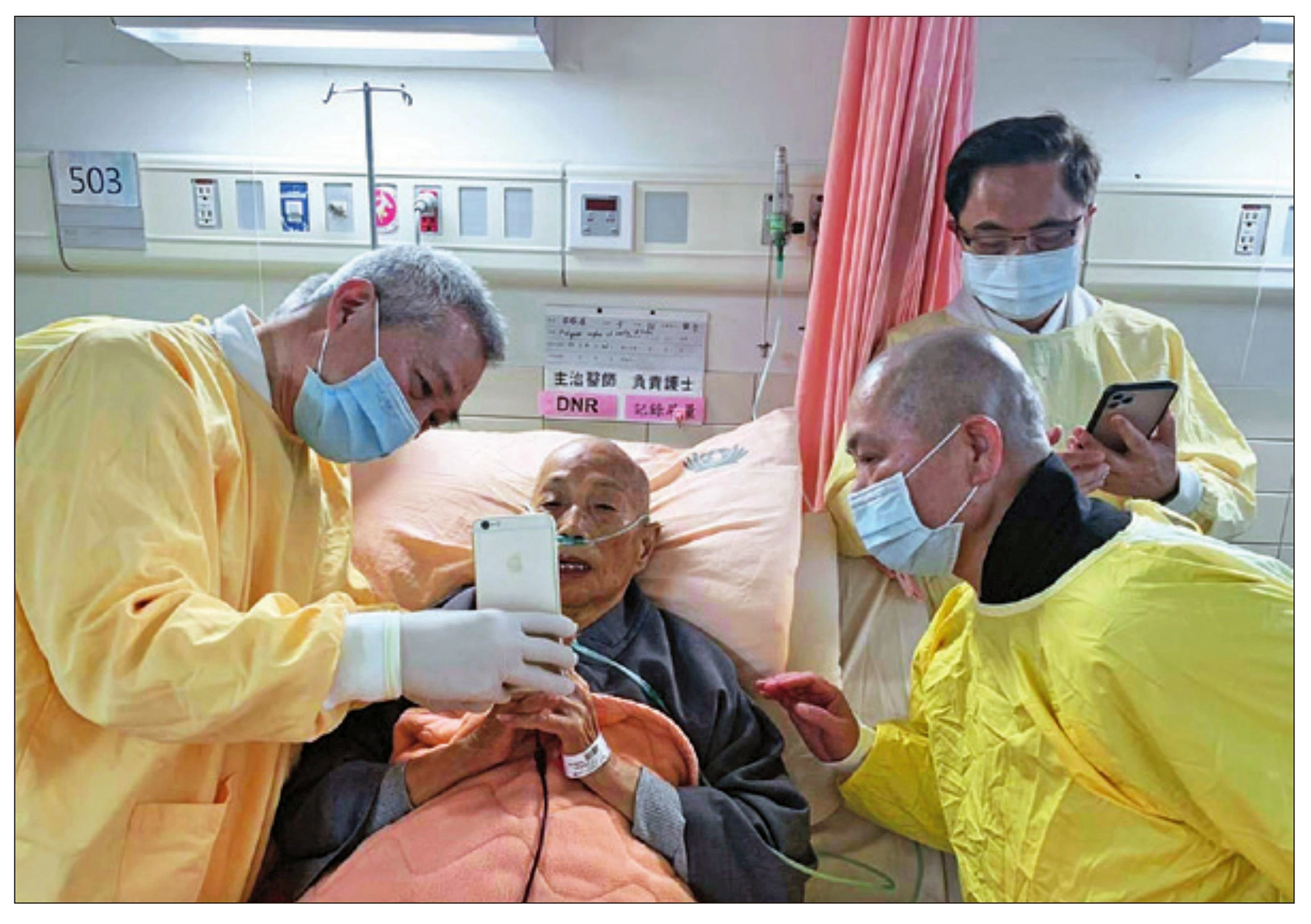 上人趕來病榻邊,王志鴻副院長說明病況:「講話還能聽得到,稍微有反應。」林欣榮院長說:「眼睛會眨。」