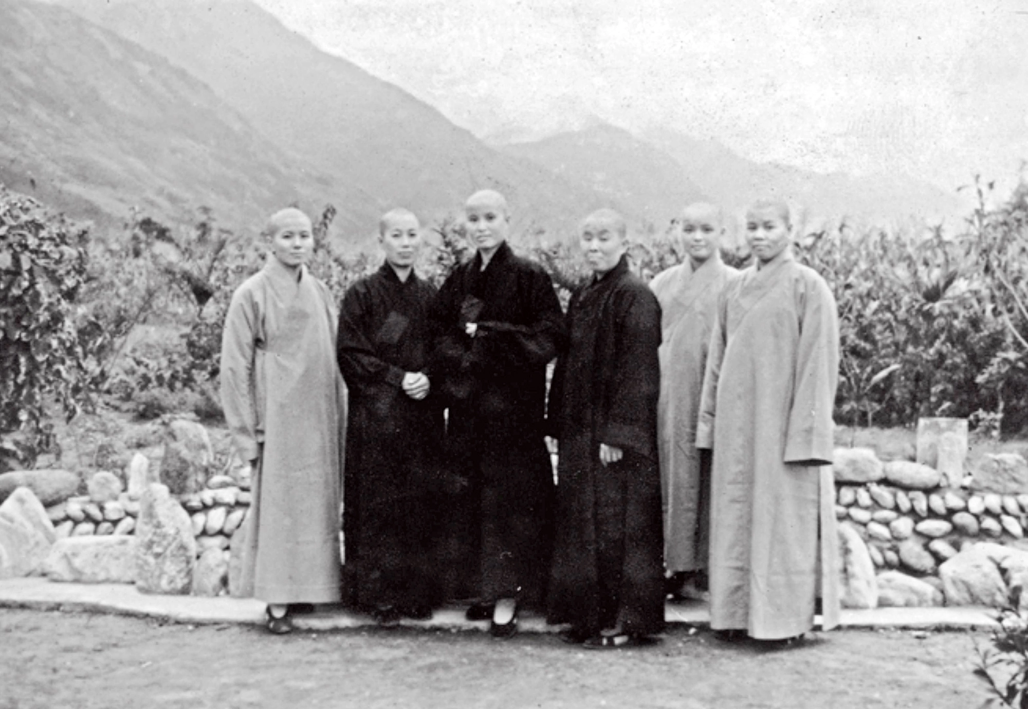 一九六九年靜思精舍啟用後,帶髮修行五年多的紹雯與紹恩圓頂出家,法號德融(左一)、德恩(右二)。右一為德仰師父,右三為德昭師父、左二為德慈師父。