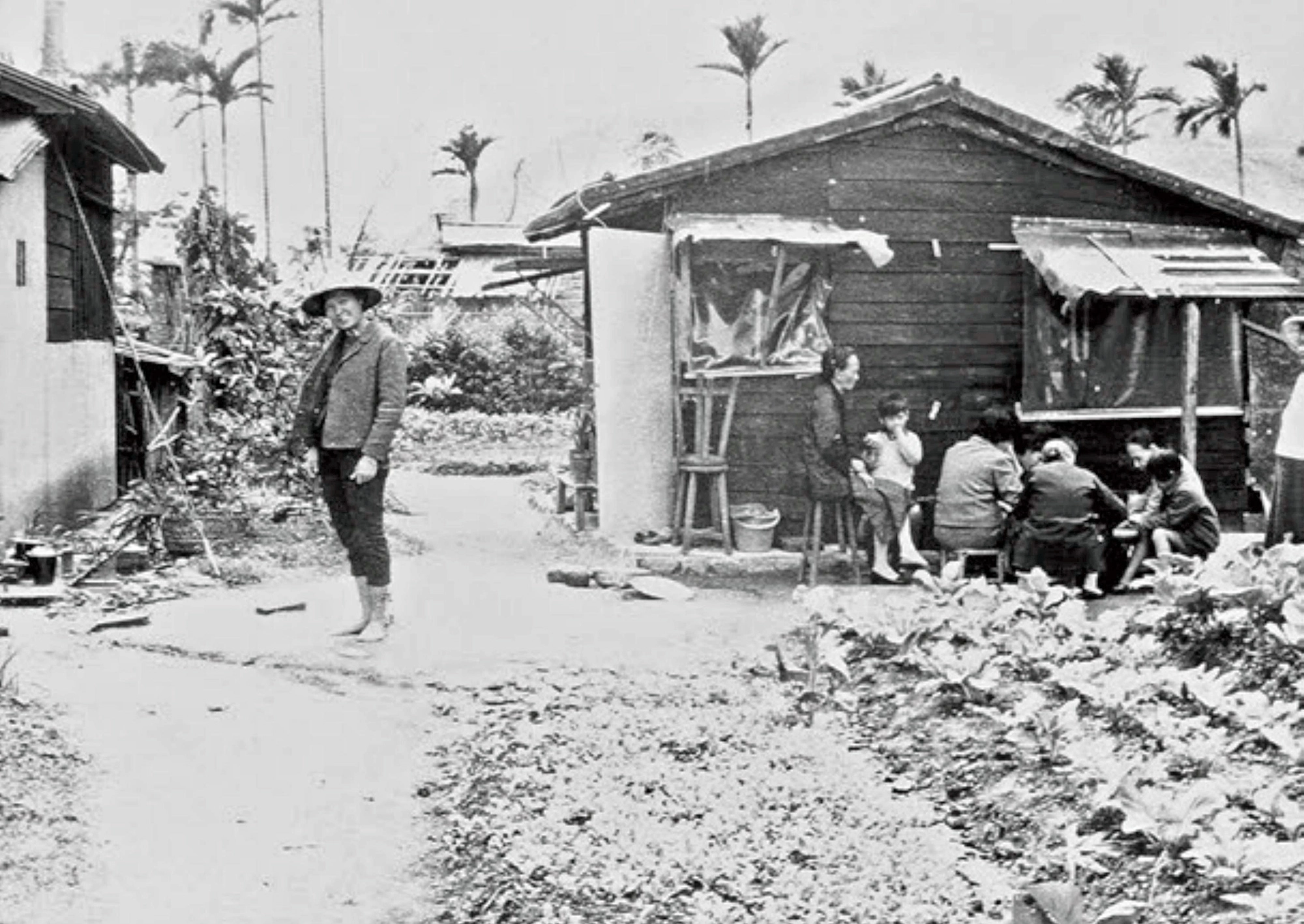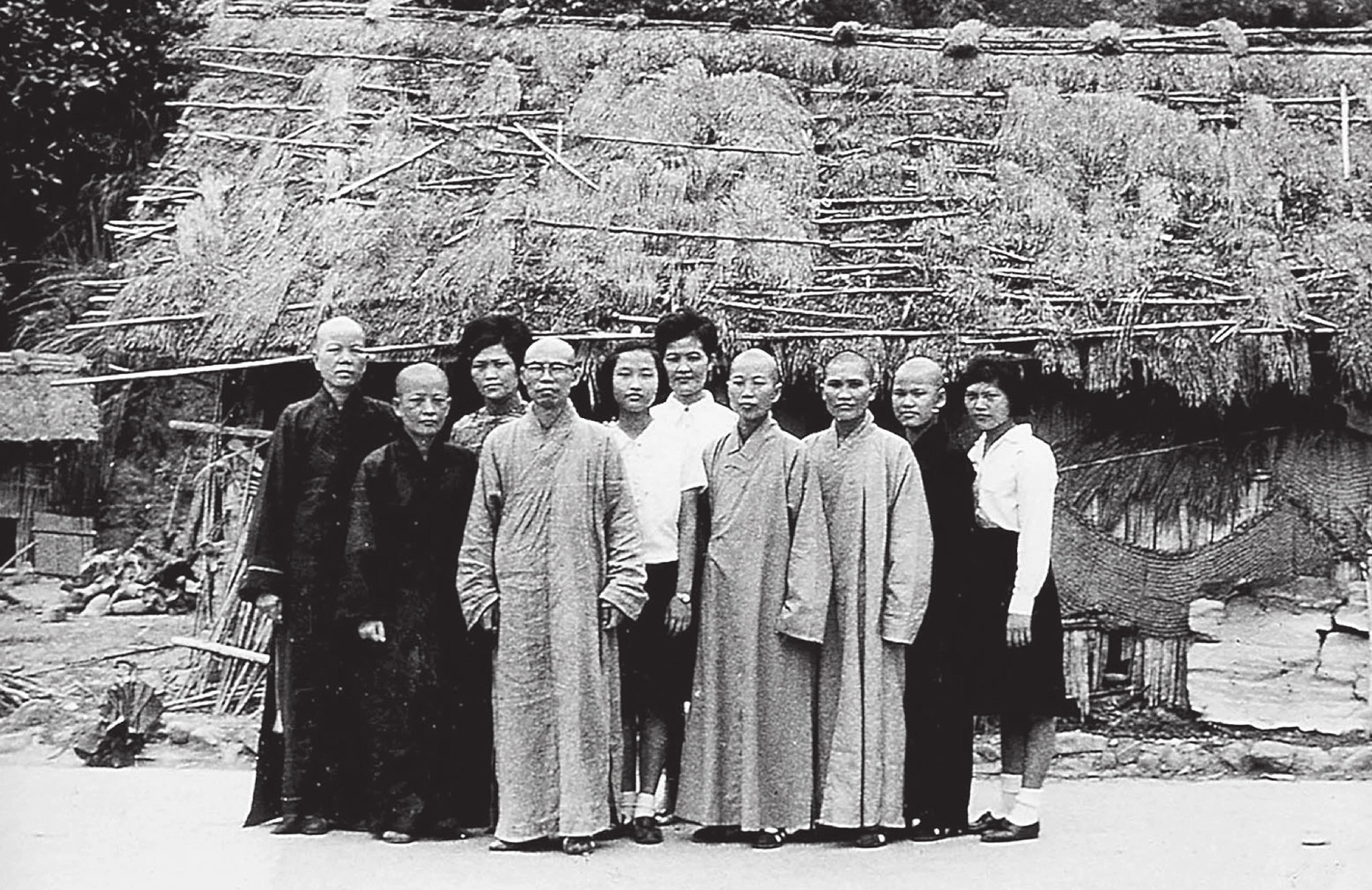 一九七〇年七月,慈師父(右四)陪同惟勵法師(前排左二戴眼鏡者)到鳳林「六階鼻」訪視蝸居在草厝裏的一對祖孫。