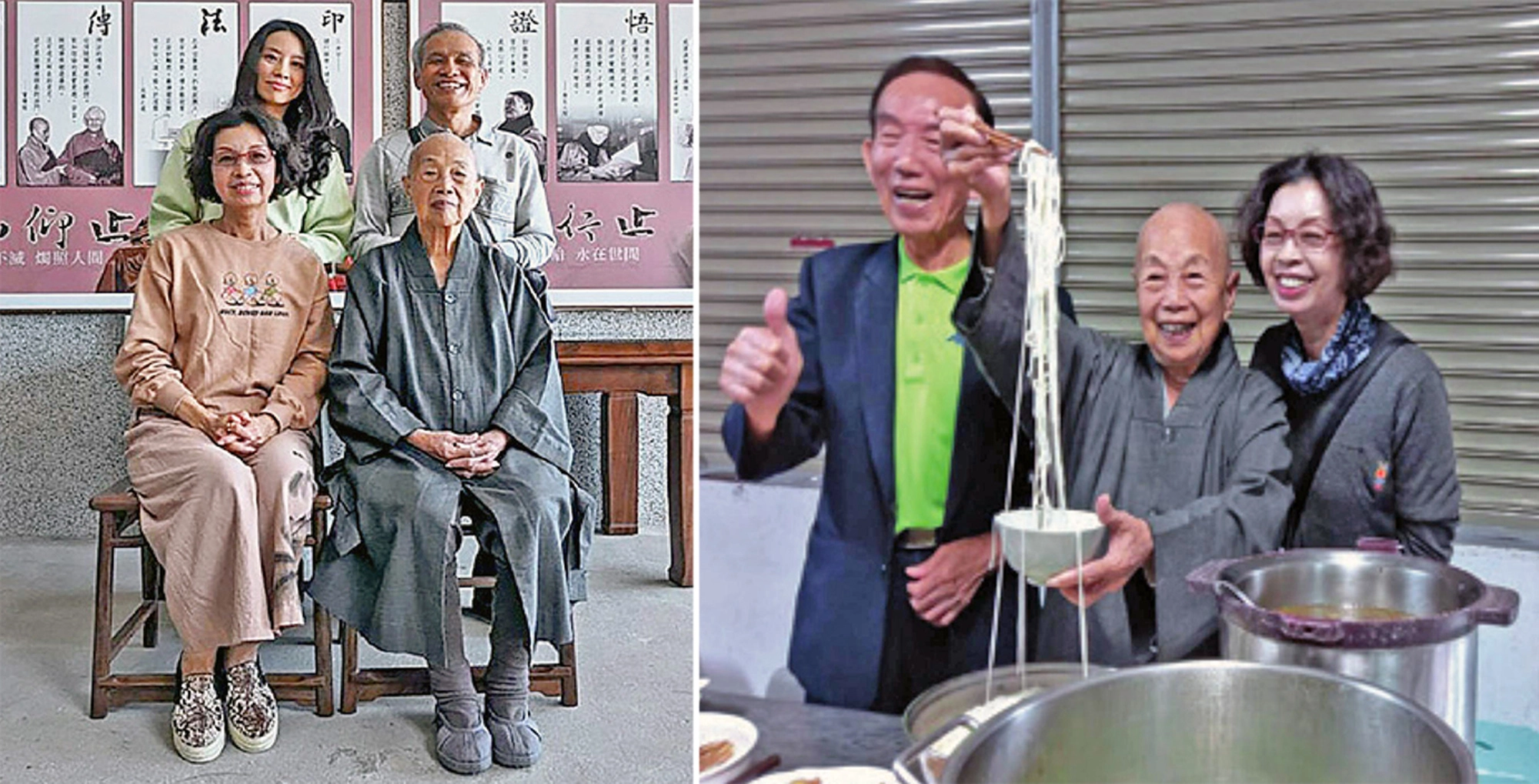 左圖為真容夫婦及女兒與慈師父合影。右圖為二〇一九年慈師父八十五歲生日,真容與慈師父俗家親弟弟來陶慈坊祝壽。