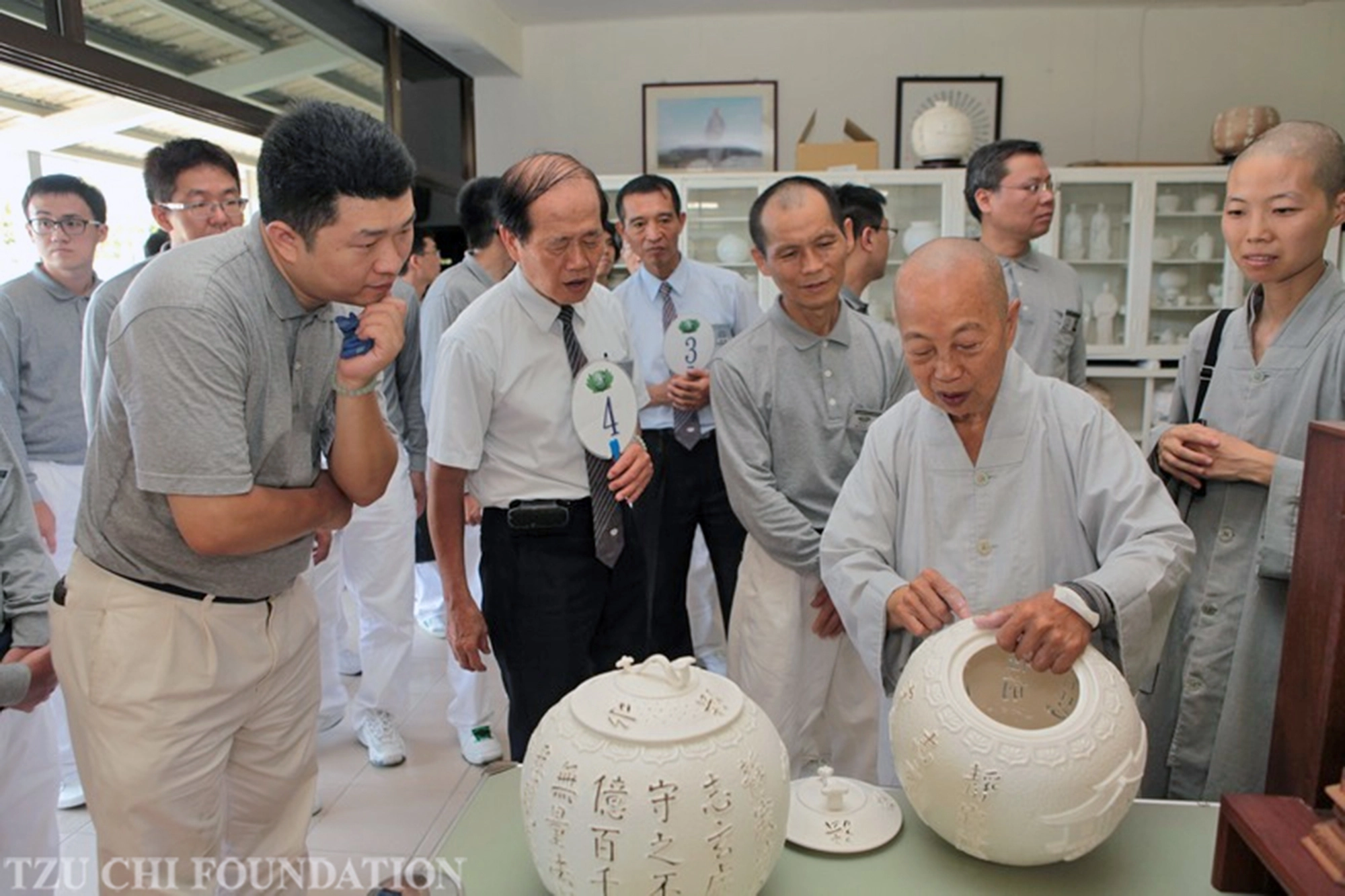精舍巡禮,德慈師父向學員介紹陶慈坊之陶瓷作品。(攝影:黃裕銘)