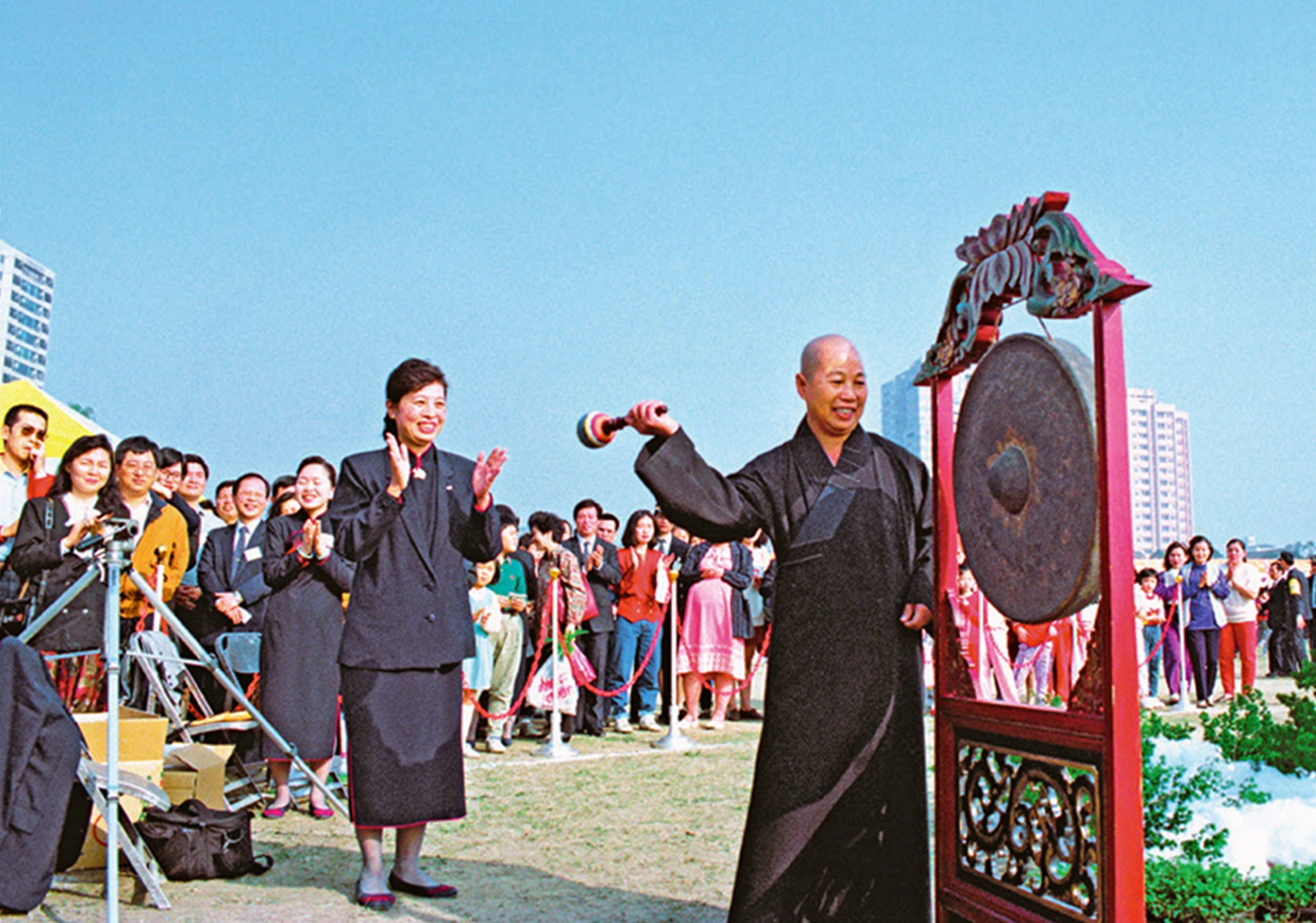 一九九一年十二月二十五日在臺灣大學舉辦的「用愛心擋嚴冬」──大陸賑災義賣園遊會,慈師父率先敲響愛心鑼。(攝影:黃錦益)