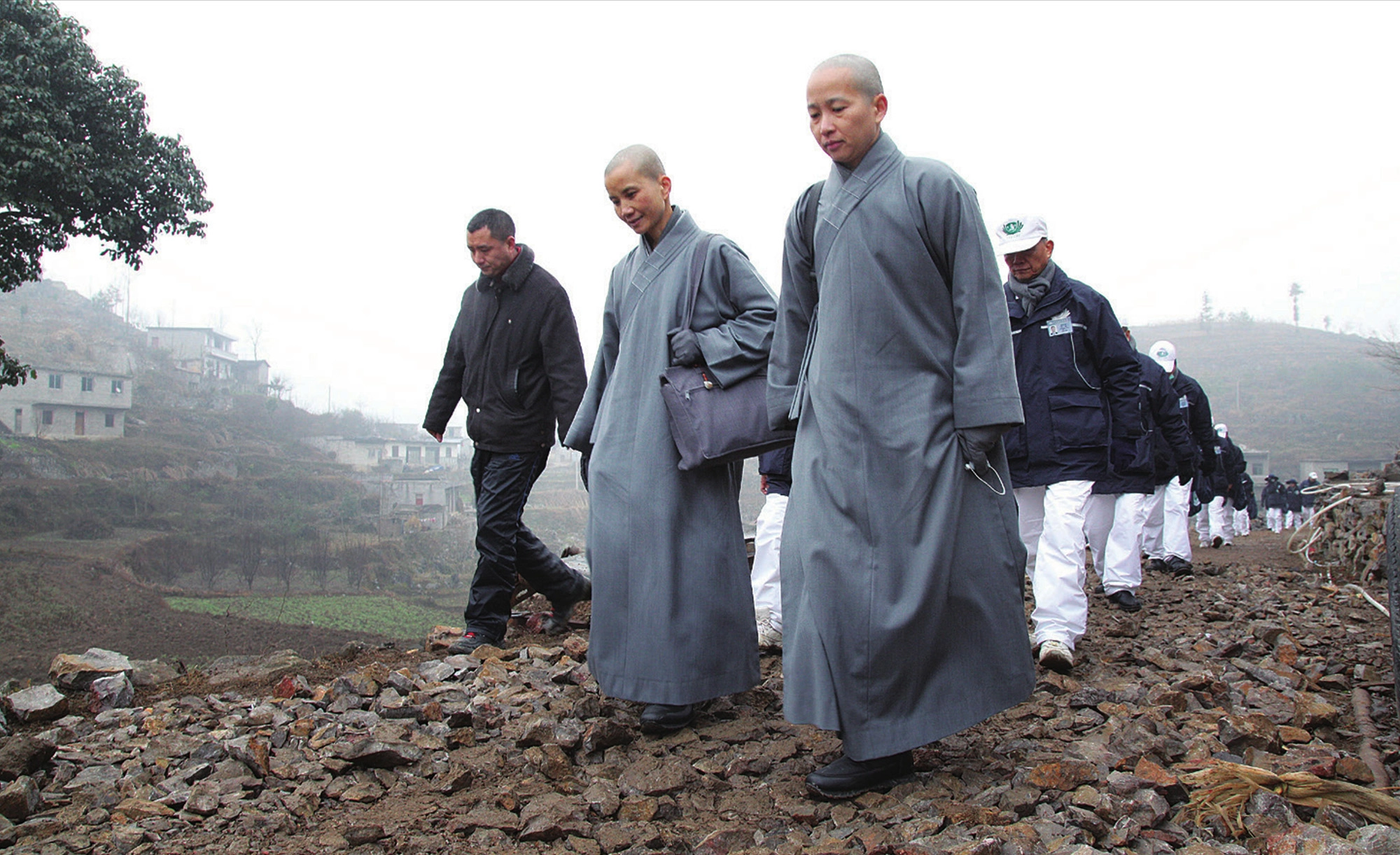 靜思僧團不是閉門修行,而是走入人間苦難,力行菩薩道。在慈濟大學社會工作學系擔任助理教授的純寬師父(右),二〇一一年參與慈濟在貴州羅甸的冬令發放,與靜思精舍德勘師父(左)及慈濟志工下鄉訪視。 (攝影:蕭嘉明)