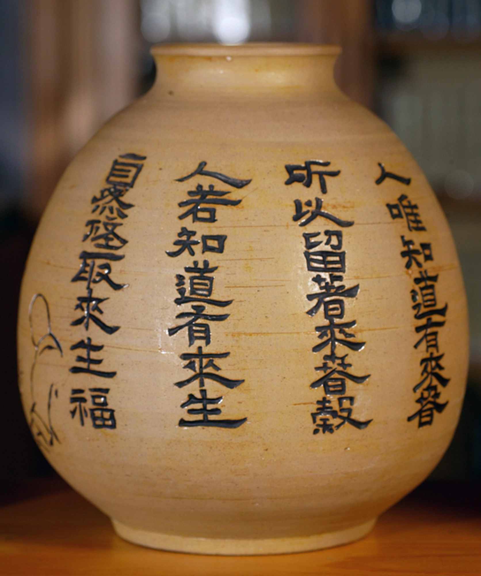 慈師父陶藝作品「人唯知道有來春,所以留著來春穀;人若知道有來生,自然修取來生福。」(攝影:蔡淑婉)