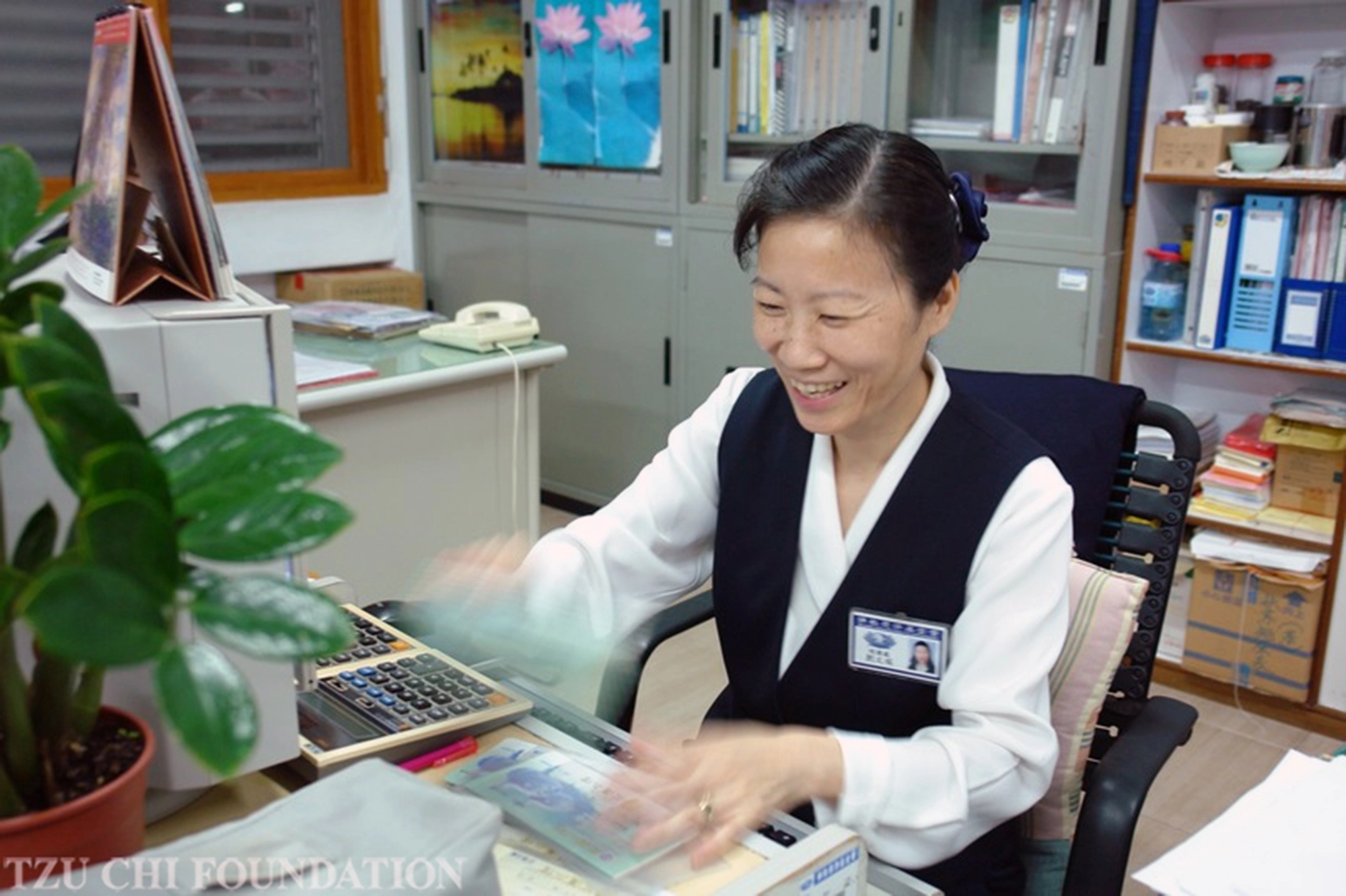 慈濟基金會第一位員工劉文瑛師姊(揚憫),數十年來發揮職志合一的精神,做起工作樂在其中。(於2006年蕭惠如拍攝)