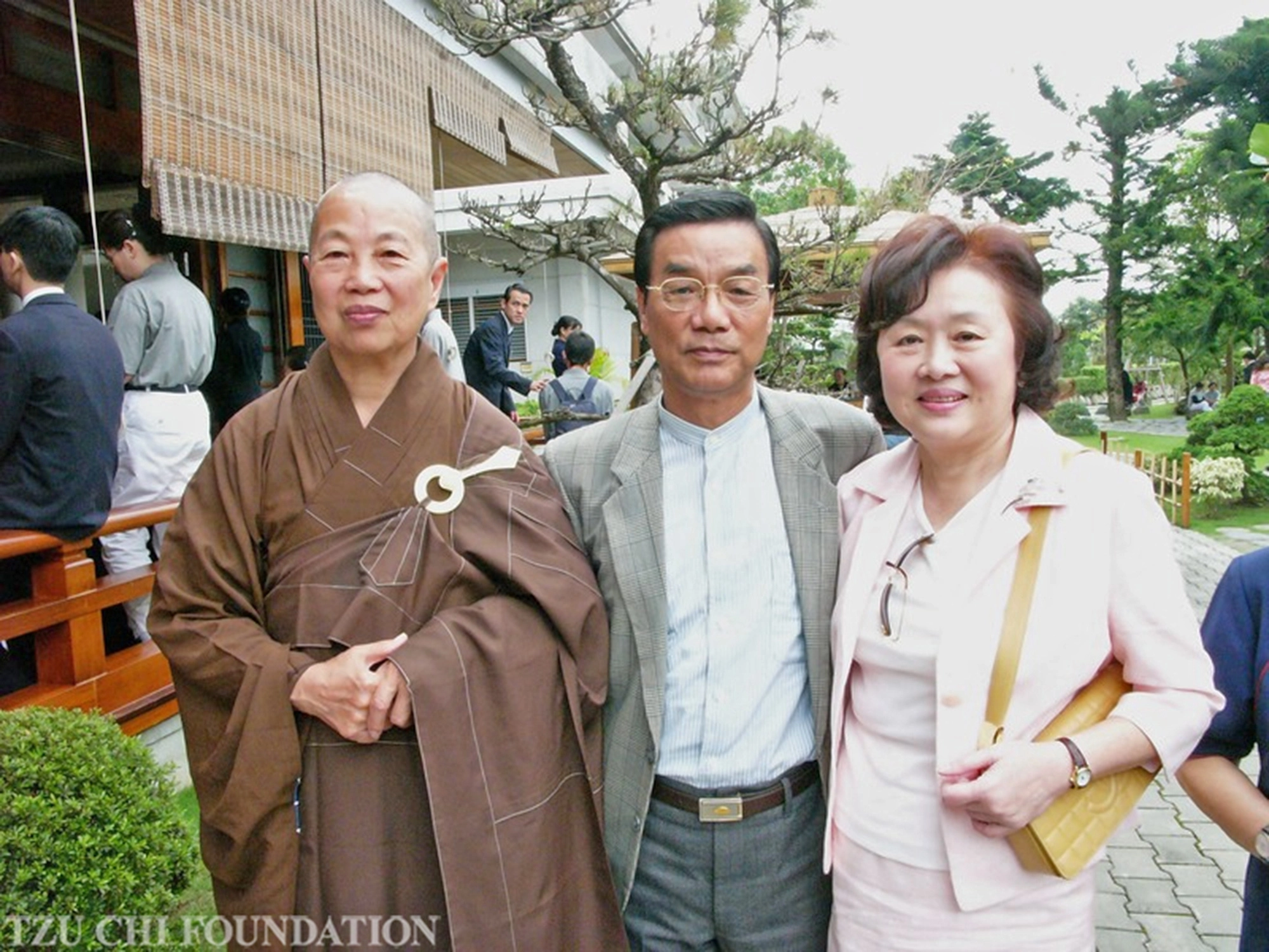 慈師父(左一)與早期參與仁愛街慈濟貧民施醫義診所義診的張澄溫醫師伉儷合影。(攝影:釋德宖)
