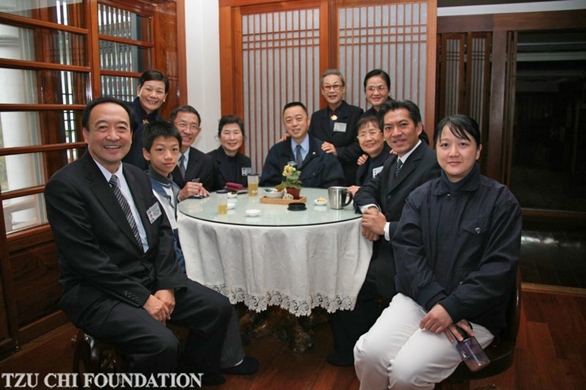 2008年新年,何日生副執行長(右二)、曾慶方師姊(右一) 與諸多法親在靜思精舍合影。(攝影:謝枝祥)