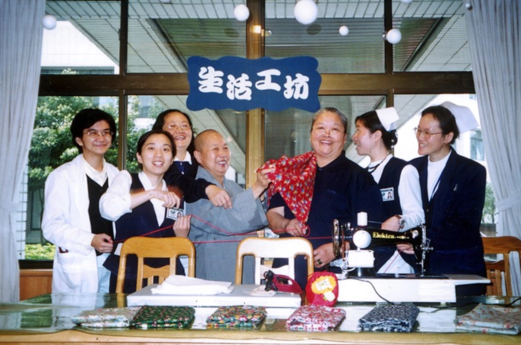 2002年花蓮慈濟醫院心蓮病房成立「生活工坊」,由靜思精舍常住師父及醫護人員發起成立,志工們貢獻器材與專業技術共同參與。(中間為德慈師父,攝影:邱淑絹)