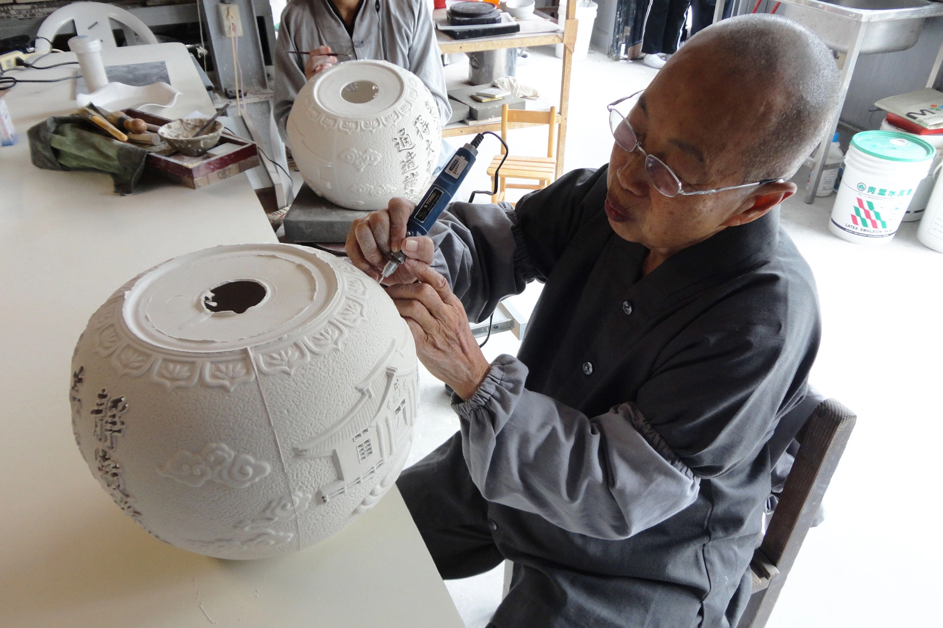 一聽見天勝師兄的聲音,慈師父立刻從工作室走出來招呼大家。我望向陶慈坊的一隅,幾部老舊的拉坏機器,仍擔負著使命在運作;一旁木架上擺放許多成品和半成品,簡易之中保有樸實古風。雖沒有寬敞場地,卻有無邊的寓意,這正是德慈師父固守勤儉風格的堅持。