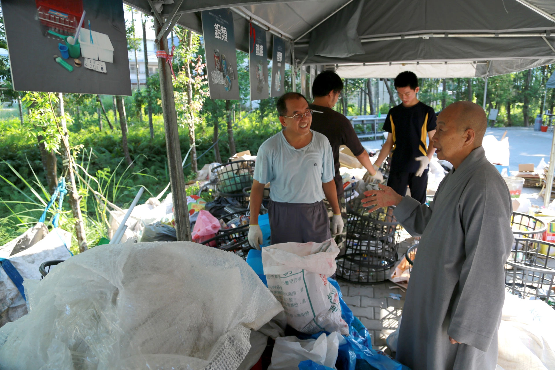 隨師到鳳林共修處,德慈師父關懷正在環保站做回收的志工。(攝影:許榮輝)