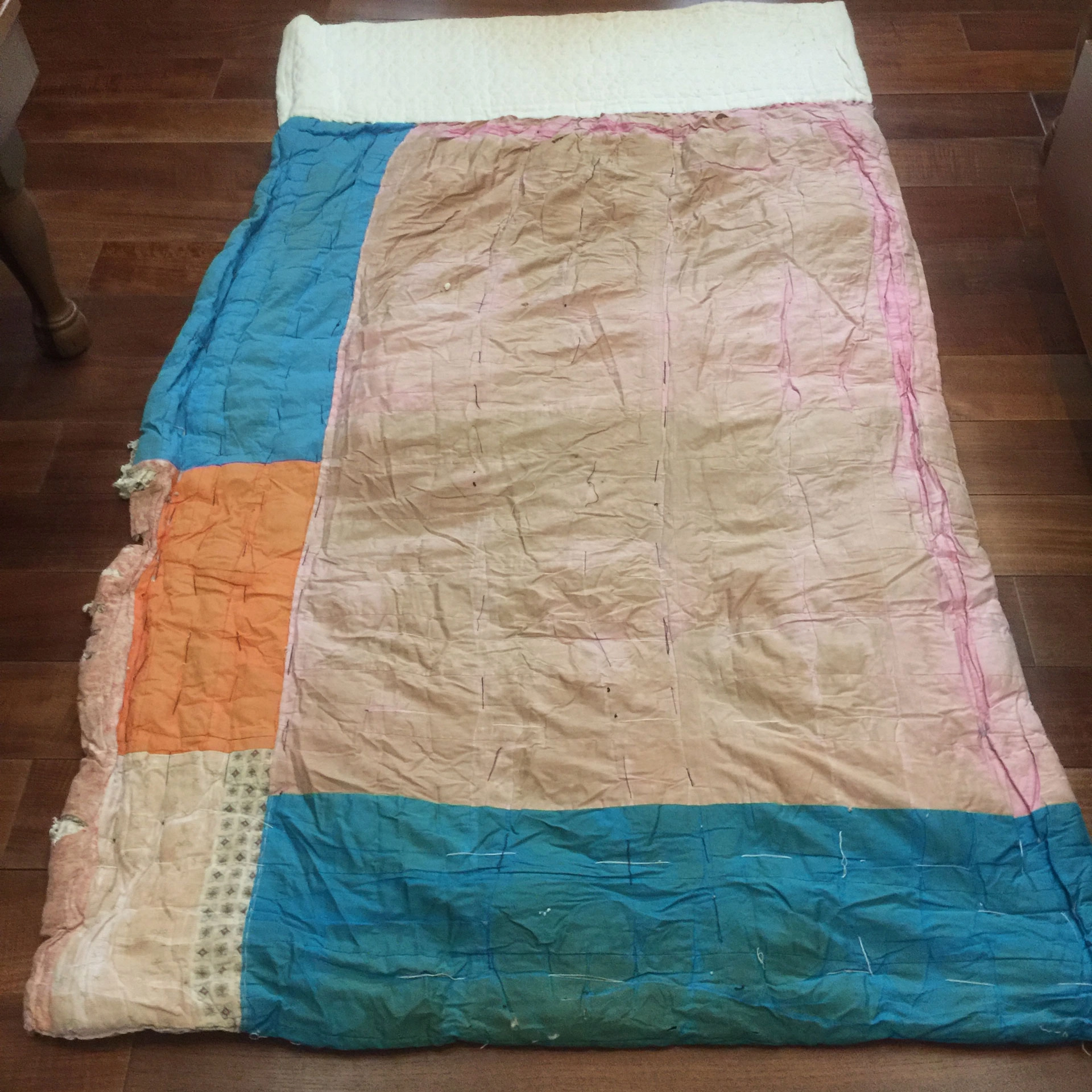 不只是衣服,早年德慈師父與德融師父還運用撿來的布,一塊一塊陸續接起來一件百衲被,經過近六十年的歲月仍可看見早期靜思精舍刻苦的歲月痕跡。(攝影:釋德澡)