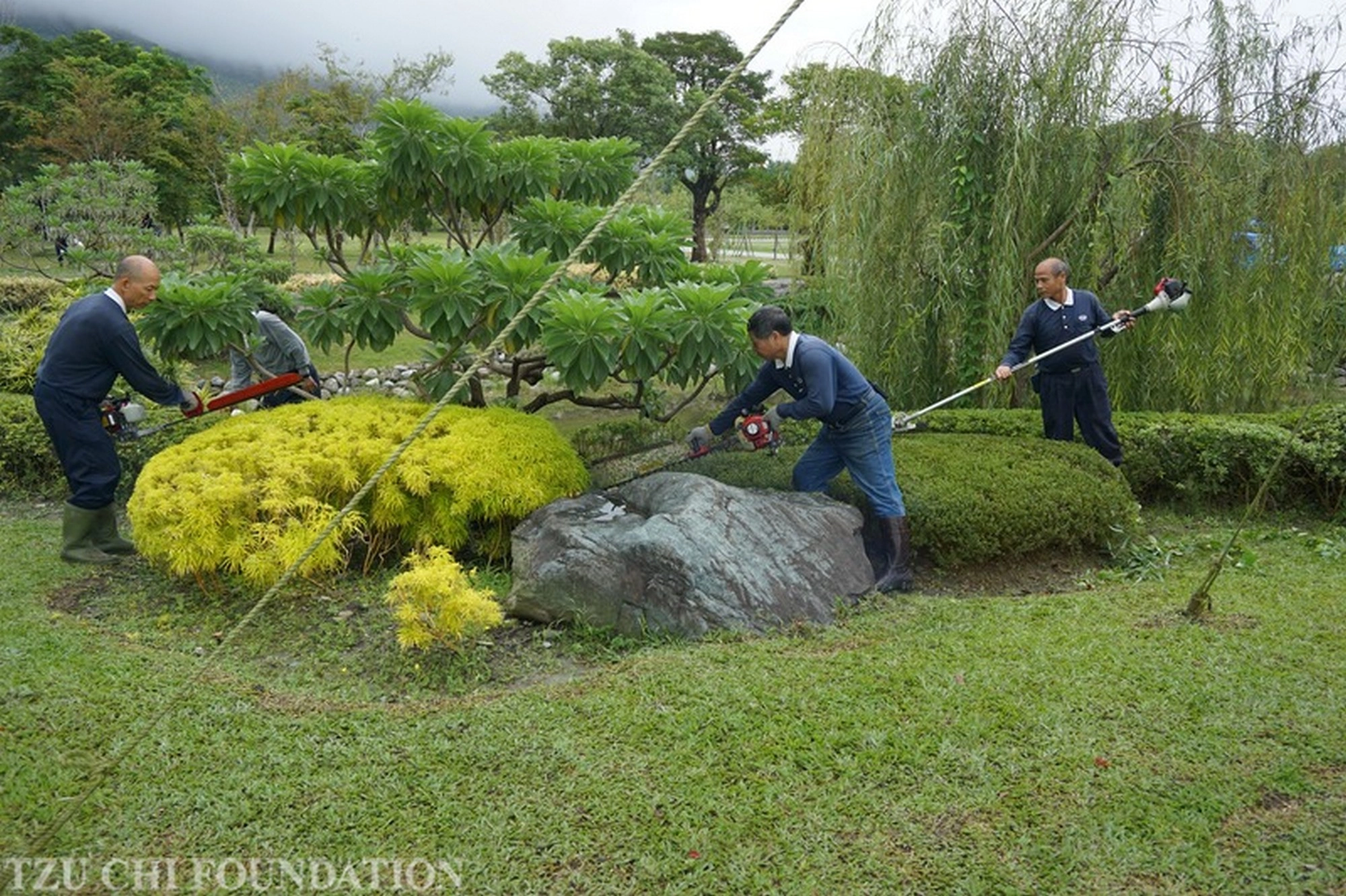 樹林區的精舍園藝志工,每個月三或四天,回到靜思精舍修剪樹木、花草,維護景觀。(攝影:林三銘)