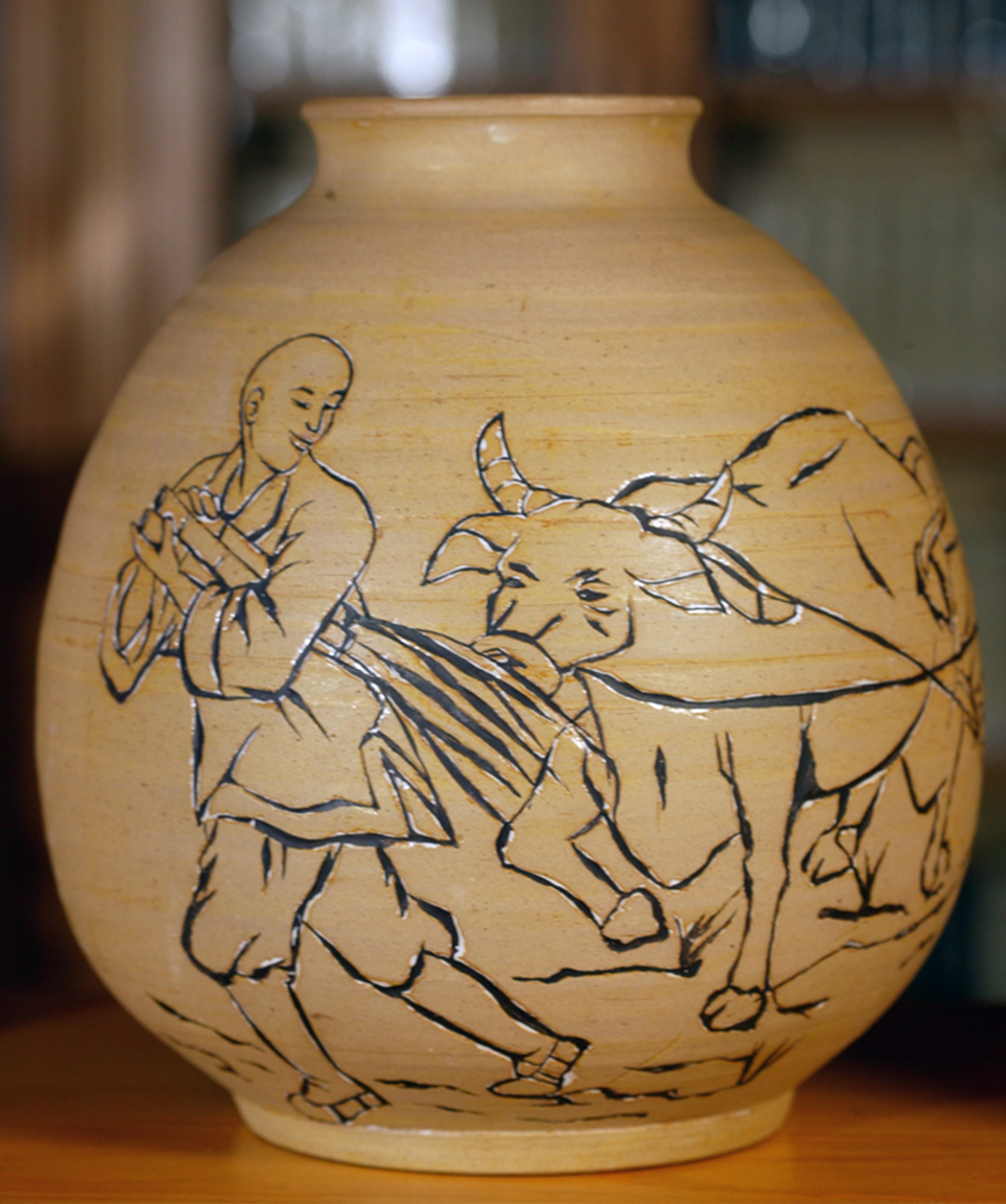 這件 「牛與甘蔗葉」是德慈師父的第一件陶藝作品。(攝影:蔡淑婉)