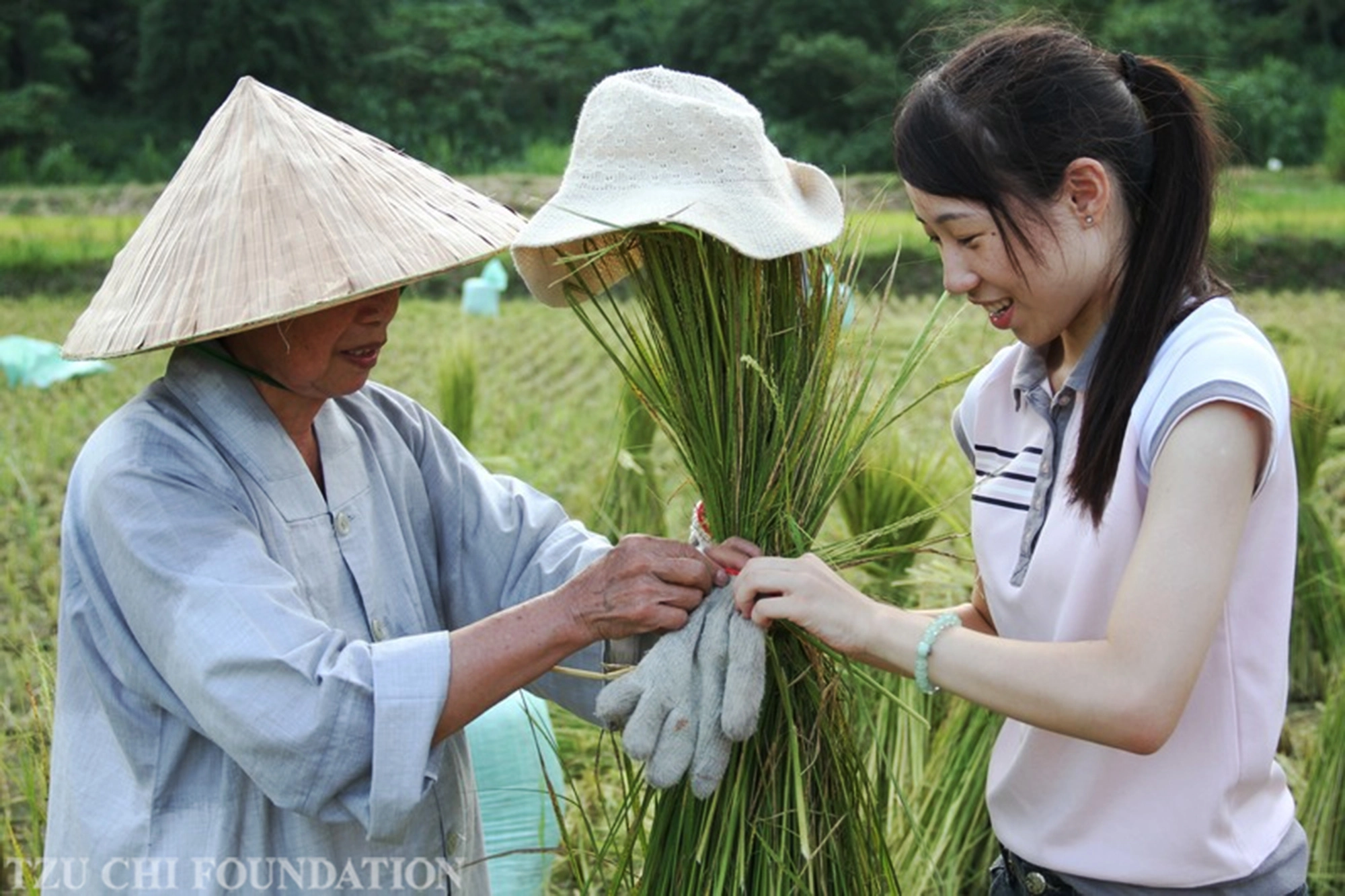 他不畏繁瑣,奔走數日找來縫紉機、嬰兒鞋等道具,並請仰師父協助車縫,重現昔日舊時光;也指導恆師父、愉師父等人在青山下農地,一字排開地輕撒稻穀、播種於田中;再如,安排昭師父拔花生、安師父爆米花、常住師父做蠟燭、曬豆子、生爐灶火、洗衣被……等,以及還原各種慈善訪視現場。慈師父稟賦聰穎、才華洋溢,在我們看來,足堪擔任導演、編劇。他不懼驕陽曝曬、汗水淋漓,也不怕大雨打溼衣衫、浸溼鞋襪,總是精神抖擻,孜孜不倦地調度。這是天賦與勤奮的相輔相成,也讓我見識到慈師父無處不顯的真本領與修行風範。