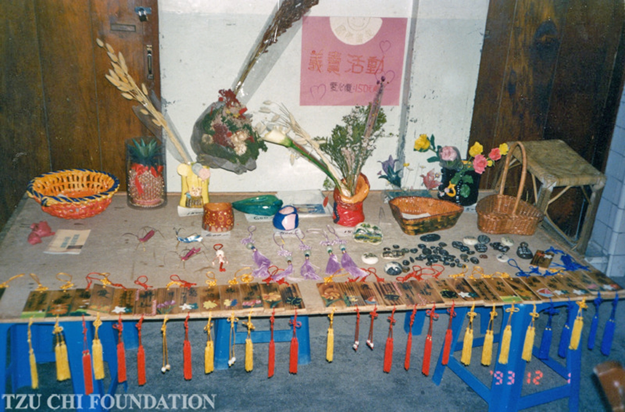 1993年靜思精舍國際賑災義賣活動,德慈師父利用小木塊做成中國結飾品,寫上靜思語或畫國畫。