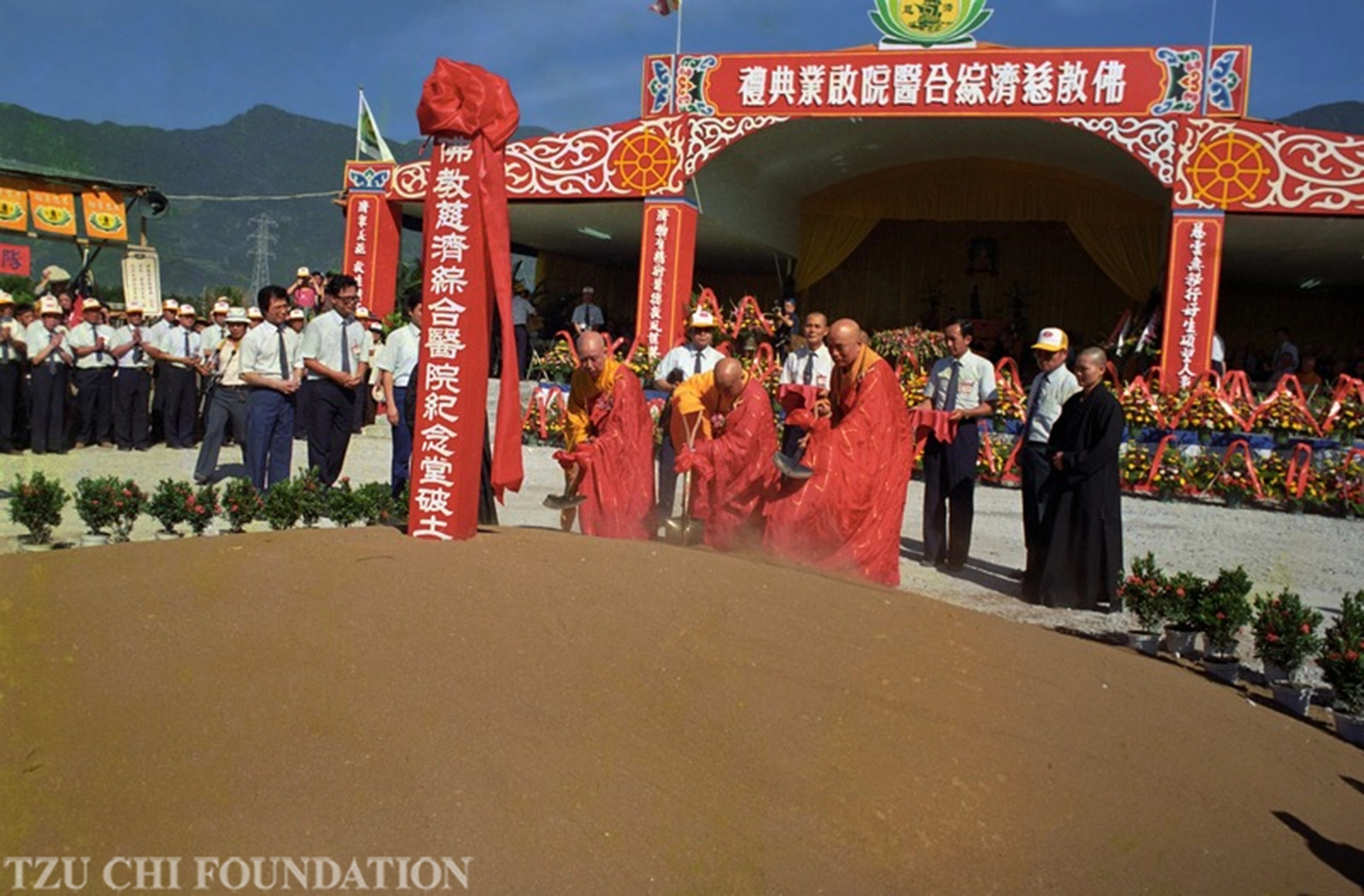 1986年花蓮慈院首期250床的醫療大樓落成啟用,花蓮靜思堂(慈濟紀念堂)於同日舉行動土典禮。(右起:真華法師 悟明法師 靈根法師/花蓮本會提供)