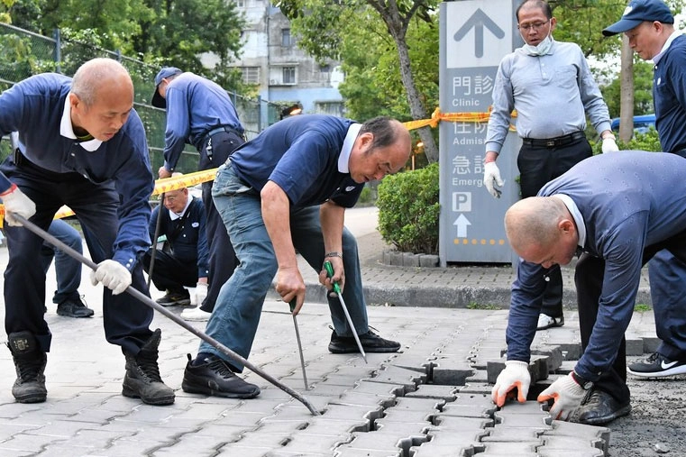 台北慈院道路的連鎖磚使用多年,經長時間人車通行及重物承載,部分磚塊因位移出現縫隙。為了維護安全,決定進行重新鋪設。(2018/04/21;攝影:蔡思培)