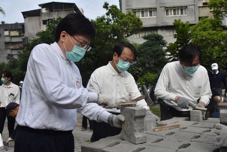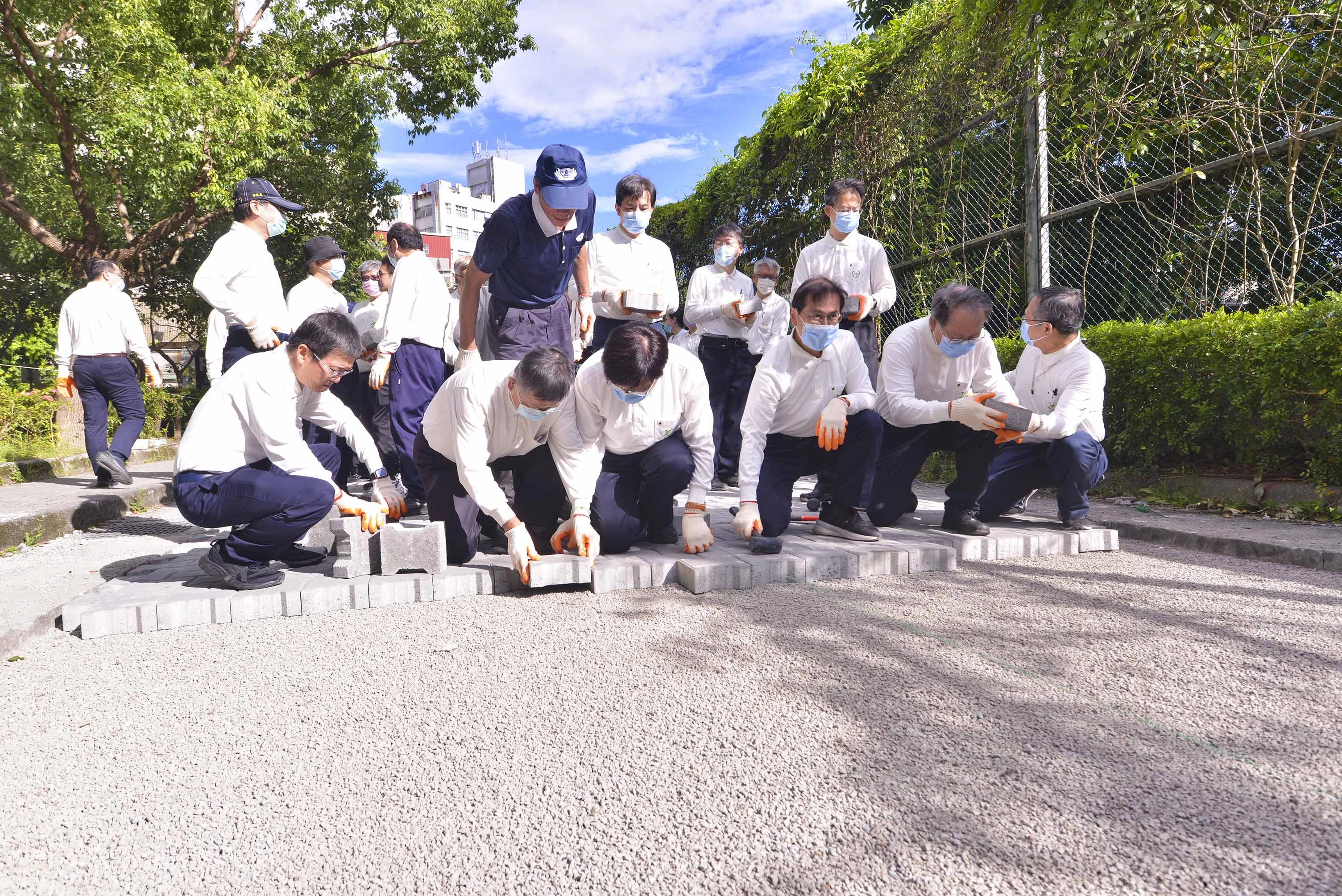 院長及幾位副院長們蹲下身來細心地將連鎖磚一塊塊擺放整齊,再用木槌輕敲固定,每個動作都不馬虎,認真專注。(攝影/范宇宏)