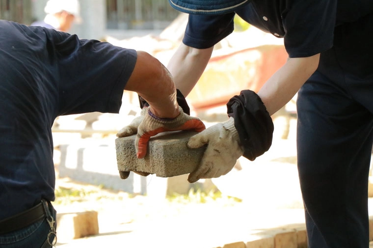 在傳磚的過程中,腳下拉著一條細繩。這條看似不起眼的繩子,其實是確保連鎖磚能夠筆直、不致偏移,極其重要的那把「尺」。(圖片來源:靜瑩提供)