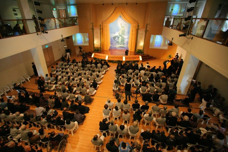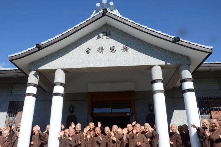 此時,精舍師父暫時放下手邊工作,身著海青於大殿前列隊送駕;精舍同仁和常住志工雙手合掌,依依不捨地向上人及隨師人員道再見。