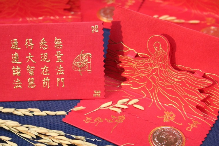 雲林一位九十三歲的阿媽送紅包(捐款)給上人,上人也將今年象徵慈悲的「大地之母」福慧紅包回贈給她。