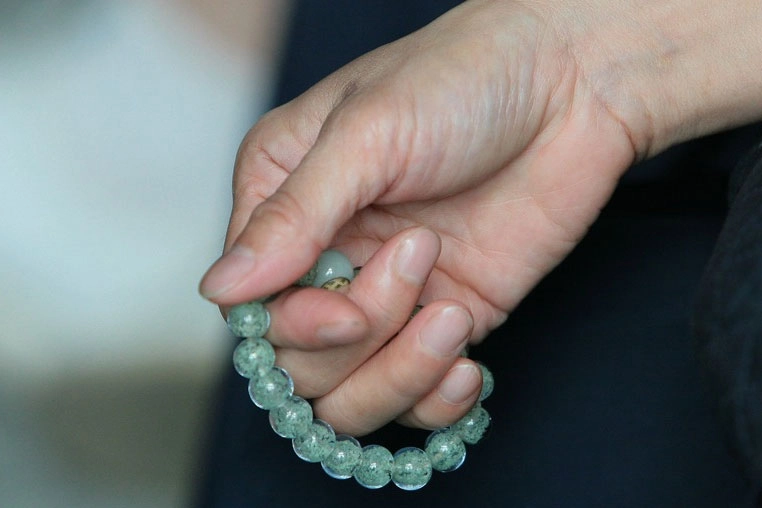 「這會發光喔!」上人輕輕拉著她的手,細心為她掛上琉璃念珠。