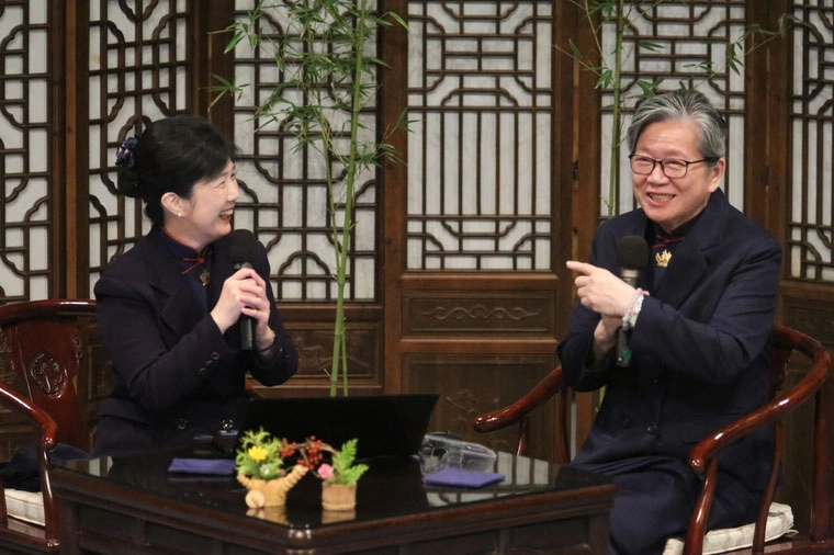 林勝勝師姊(右)分享,慈悅師姊(左)是「背」著道而行,身上承載傳承法脈、弘揚宗門的使命,同時予人心生歡喜,呈現深度人文。(攝影:黃炳添)