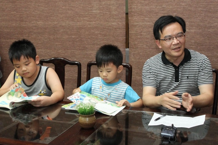 謝明智醫師投入《無量義經》音樂手語劇公演,兒子在耳濡目染下,也能背誦〈德行品〉片段。(2011/10/02;攝影:沈美君)