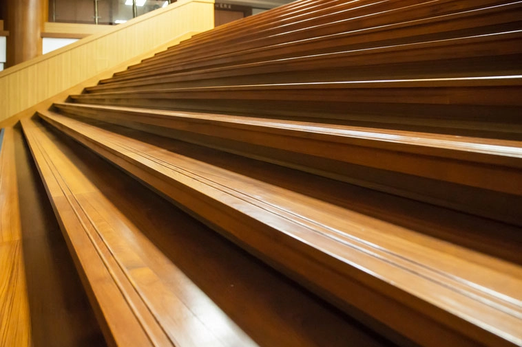 踏上台北關渡園區二樓的樓梯時,上人不時回頭望向盲人教養院的李院長,確認他是否跟得上。