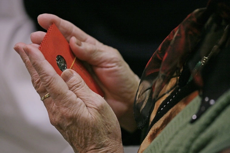 「給你『老幸福』啦!」雖坐在輪椅上,老菩薩仍合掌彎身,恭敬地將紅包獻給上人。