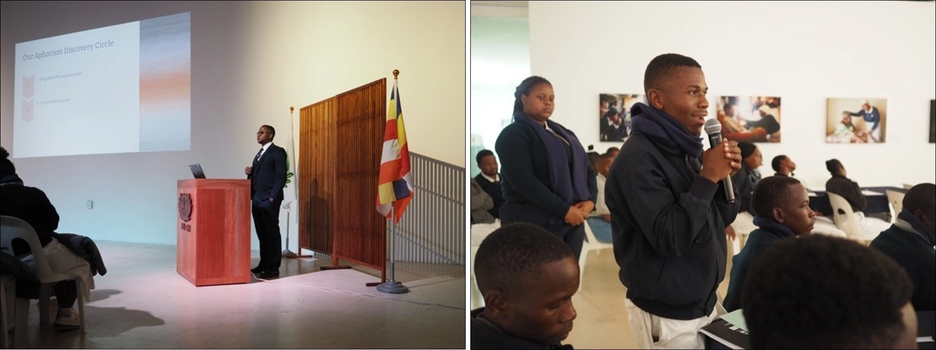 艾力士師兄(左圖)帶領德本教育團隊,分享「靜思語五段式教學」與品格教育。(圖片來源:擷取自南非簡報畫面)