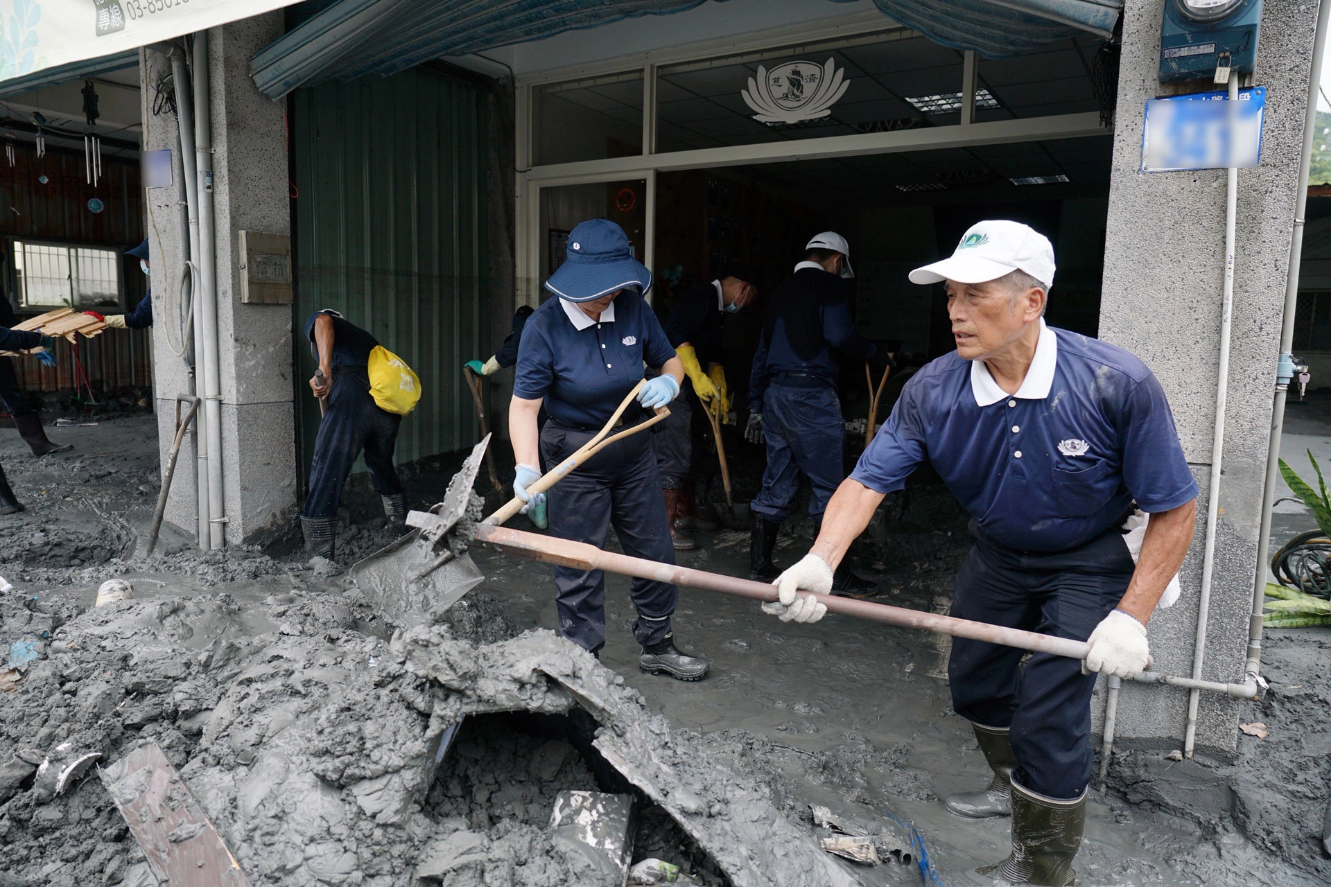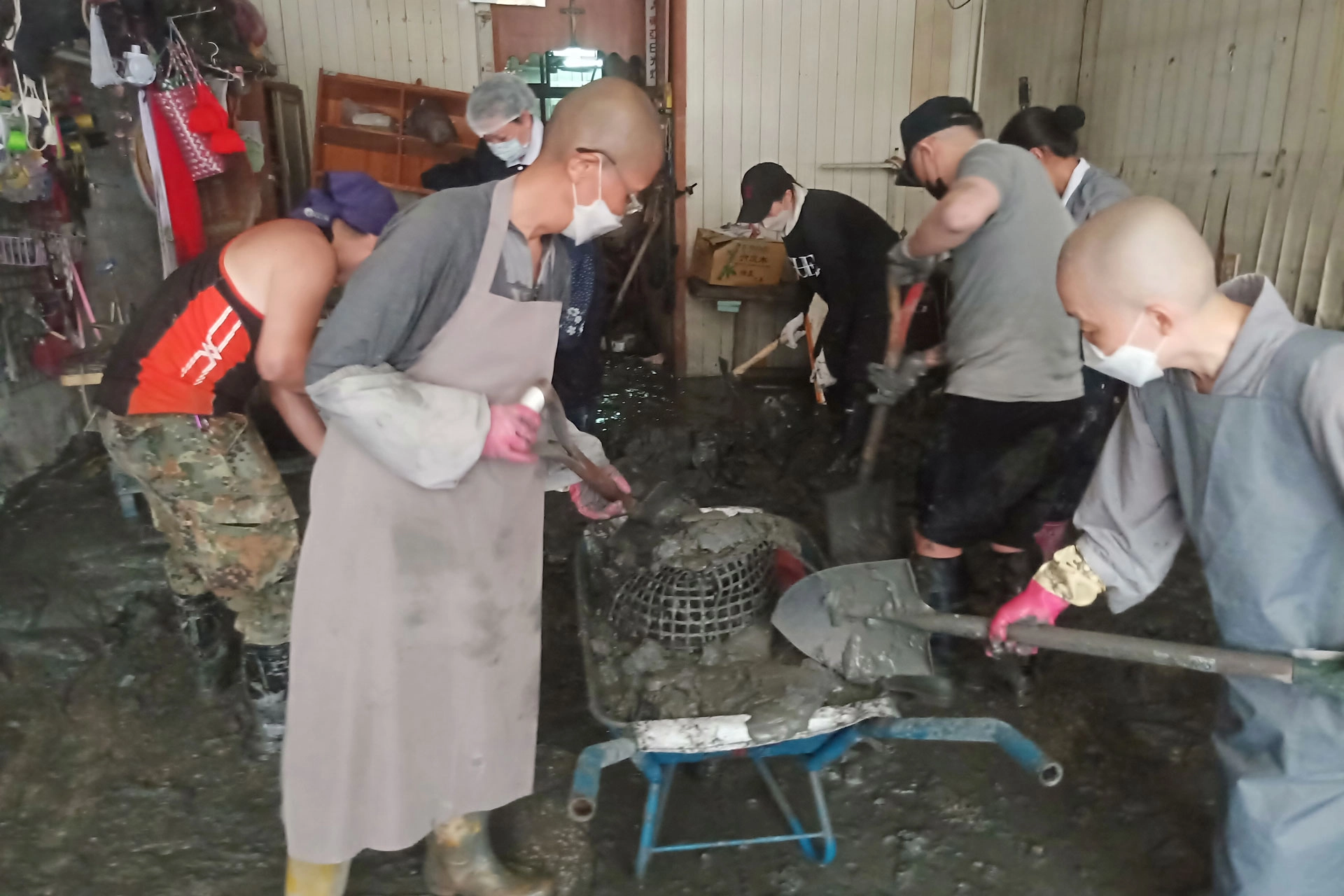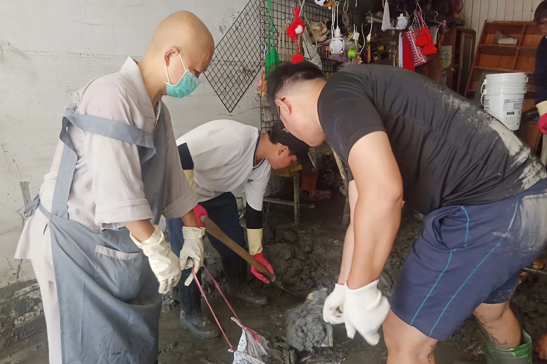 精舍一甲子以來,「一日不作,一日不食」,自力「耕」生的訓練與底蘊,師父們對「做粗重的工作」都有扎實的基礎,清掃污泥應不是難事。但是,這次的爛泥,很多人都說「又細、又黏、又硬,上面黏、底部硬」,因此儘管使盡力氣,鏟起的只有一點點。這樣的挫折,沒有澆熄大家的愛心善念,因為一鏟、一桶、一車,一掃、一推,點點滴滴都是力量,都是災民恢復如常生活最厚實的能量。