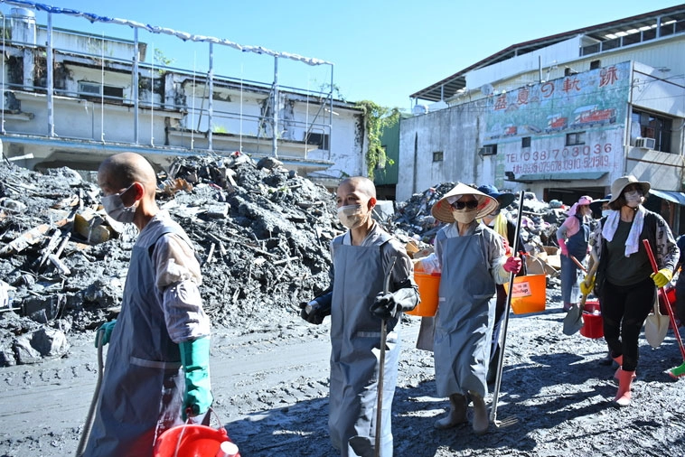 靜思精舍師父與志工拿著耙子、鏟子、水桶等工具,挺進光復災區清掃。(攝影:李彥緰)