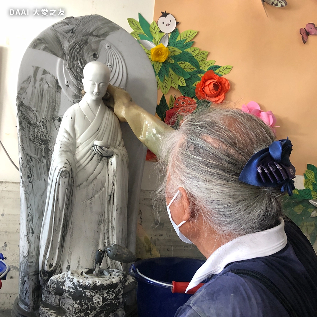 小心翼翼地將「宇宙大覺者」捧起安放,並恭敬地擦拭去污垢,當塵盡光生的那一刻,感動也鼓舞了在場所有的志工。(圖片來源:大愛台鄭丞軒、陳姻岑)