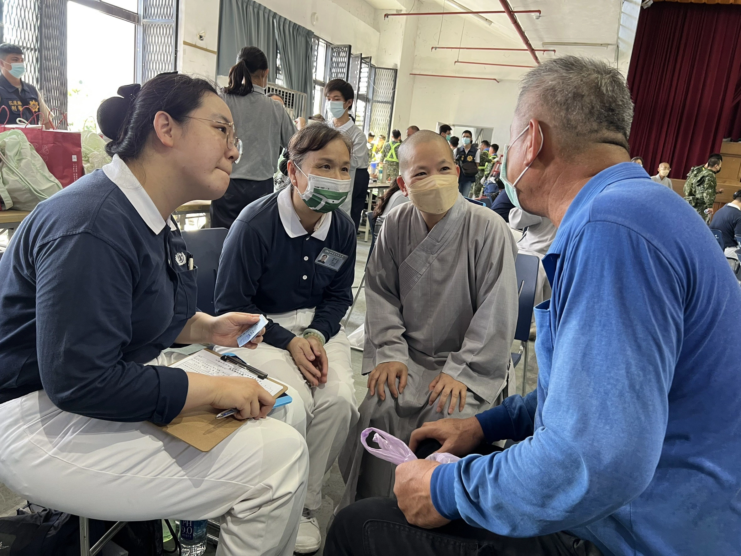 德澡師父聆聽並安撫著受災鄉親不安的情緒,同時藉由佛法的智慧引導鄉親調整心念,找到內心的平和。(攝影/廖文聰)