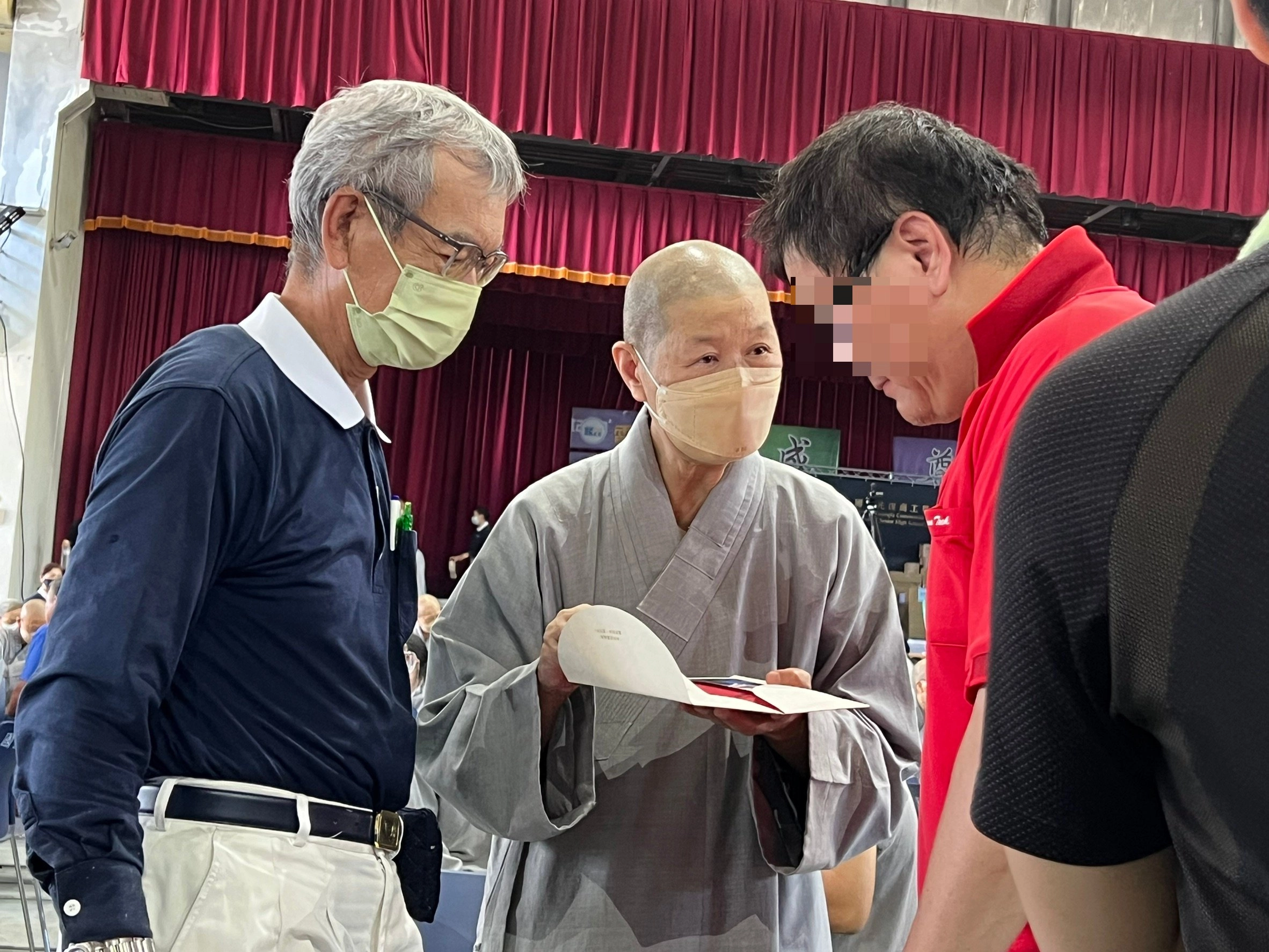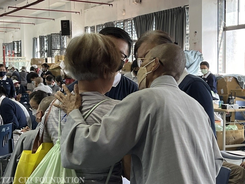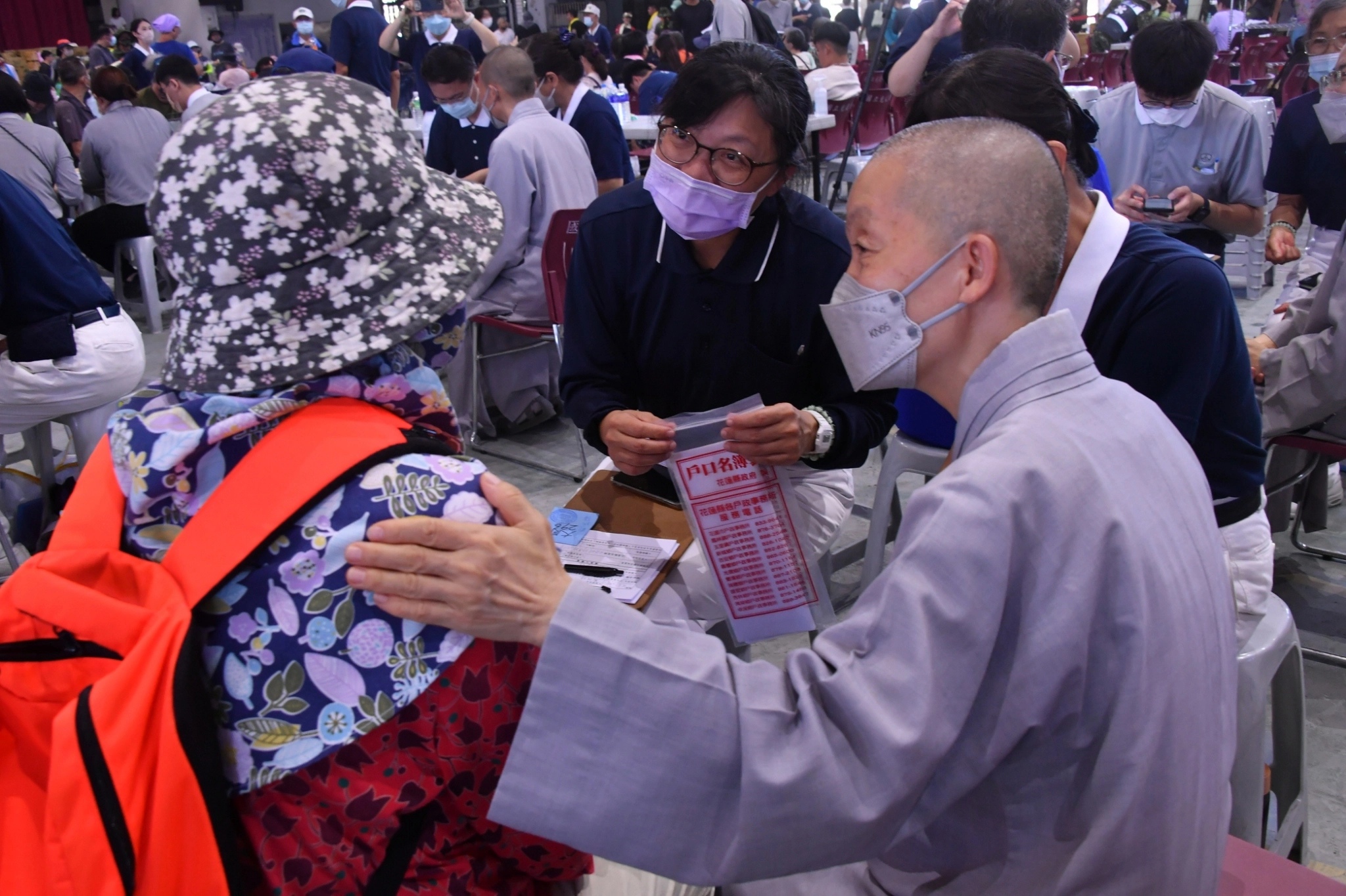 精舍師父參與定點發放,透過面對面談心與膚慰,讓災民釋放心中的悲苦與不安,並增強他們重建家園的信心。(攝影/黃思佳)
