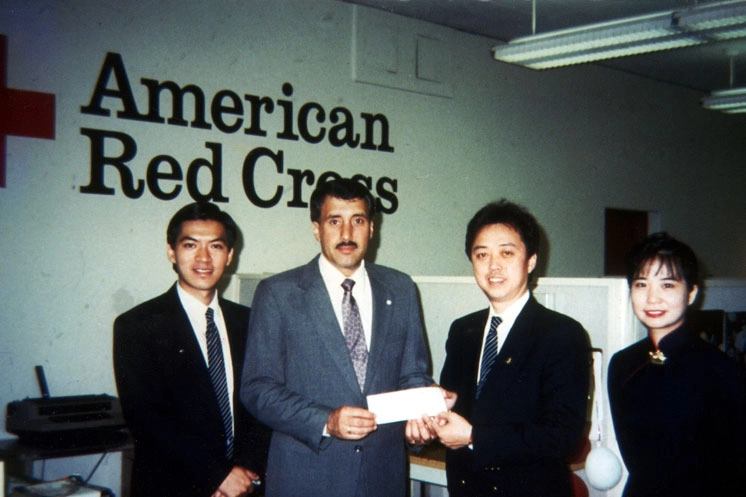 美國分會黃思賢師兄(右二)拜會國際紅十字會洛杉磯分會負責人Ronald M. Farina,轉交全美慈濟人為孟加拉災民募集的十五萬七千一百四十九美元支票。(1991/06/25;圖片來源:黃錦益翻拍)