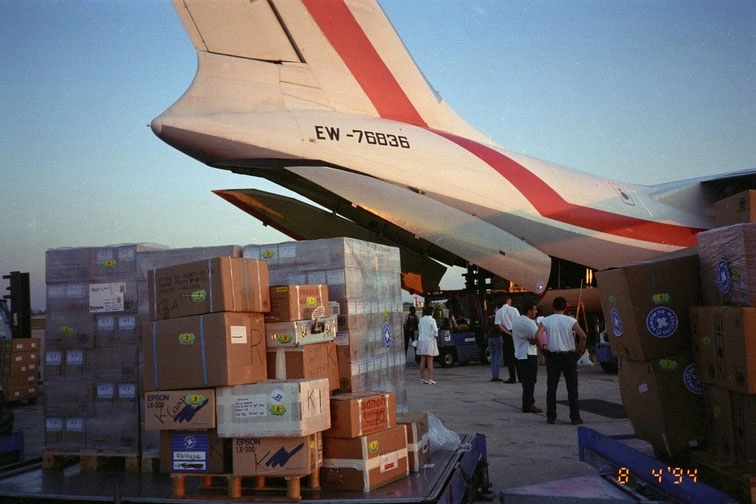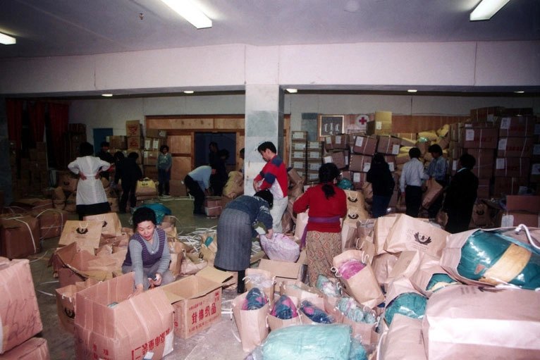嚴冬將至、物資短缺,外蒙古民眾面臨饑寒威脅;慈濟人前往發放物資,關懷當地民眾,紅十字會人員協助整理打包物資。(1992/12/28-1993/01/03;圖片來源:賑災團提供)