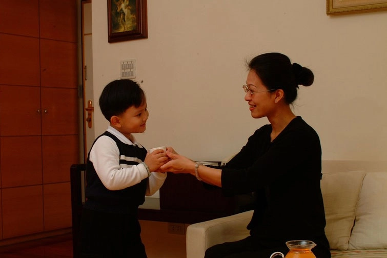 「站好!」媽媽提醒承諺在上人面前要恭敬。