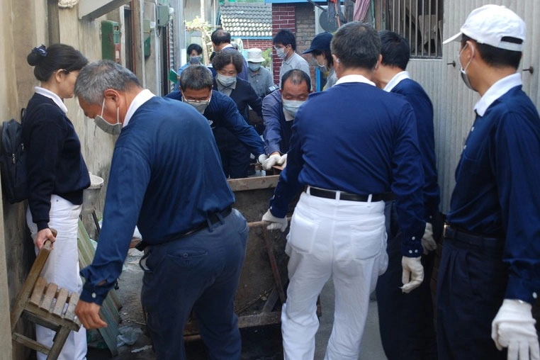 慈濟人為獨居的劉善爺爺清掃家園。(2008/01/07;攝影:黃善繼)