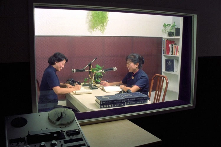 「慈濟世界」廣播第一代主持人紀陳月雲師姊(靜暘,右)、文素珍師姊(靜潔,左)錄製節目。(1989年9月;攝影:黃錦益)